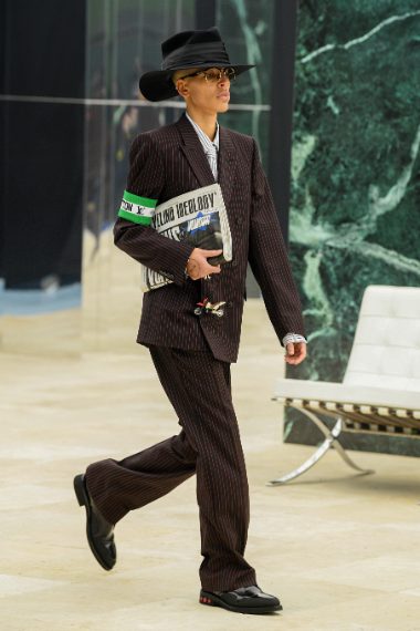 Il designer Virgil Abloh scardina tutte le convenzioni dell'abbigliamento maschile e immagina i classici in una chiave nuova e anticonvenzionale: dal gessato al cappotto doppiopetto, dalla tuta da pilota al cardigan in lana. Sono i dettagli a fare la differenza: borsoni colorati, bottoni a forma di aeroplanino, occhiali vintage e stivali texani