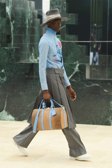 Il designer Virgil Abloh scardina tutte le convenzioni dell'abbigliamento maschile e immagina i classici in una chiave nuova e anticonvenzionale: dal gessato al cappotto doppiopetto, dalla tuta da pilota al cardigan in lana. Sono i dettagli a fare la differenza: borsoni colorati, bottoni a forma di aeroplanino, occhiali vintage e stivali texani