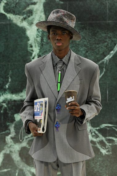 Il designer Virgil Abloh scardina tutte le convenzioni dell'abbigliamento maschile e immagina i classici in una chiave nuova e anticonvenzionale: dal gessato al cappotto doppiopetto, dalla tuta da pilota al cardigan in lana. Sono i dettagli a fare la differenza: borsoni colorati, bottoni a forma di aeroplanino, occhiali vintage e stivali texani