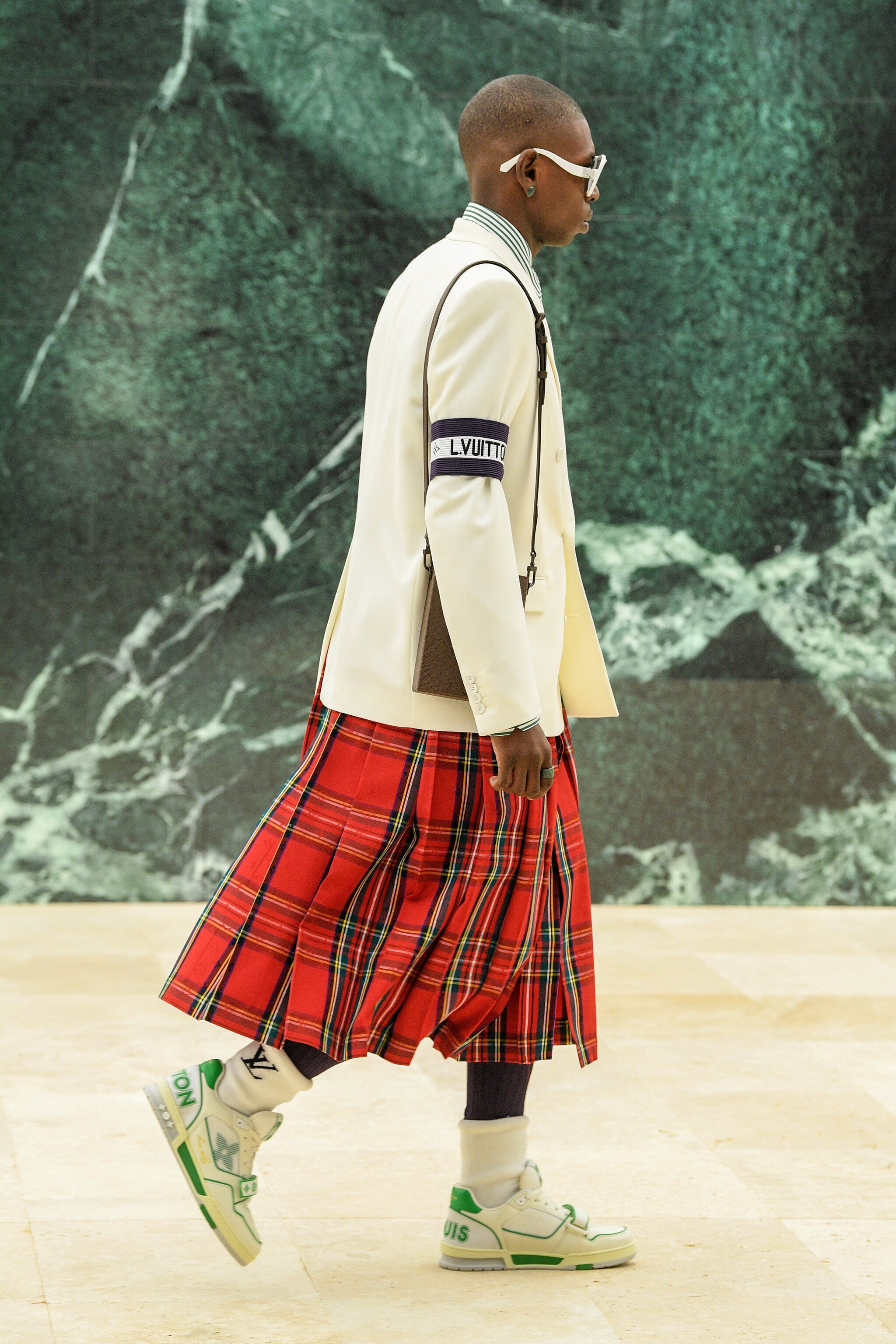 Il designer Virgil Abloh scardina tutte le convenzioni dell'abbigliamento maschile e immagina i classici in una chiave nuova e anticonvenzionale: dal gessato al cappotto doppiopetto, dalla tuta da pilota al cardigan in lana. Sono i dettagli a fare la differenza: borsoni colorati, bottoni a forma di aeroplanino, occhiali vintage e stivali texani