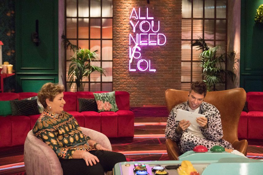 Fedez, il look fiorato per "LOL - Chi ride è fuori"
