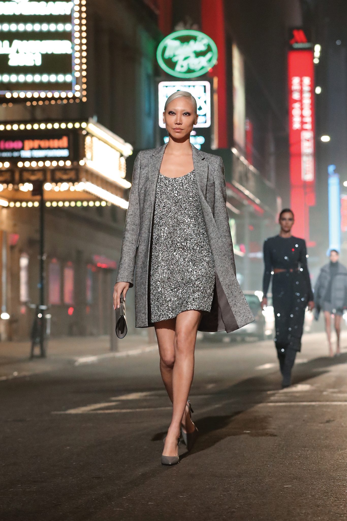 Per i 40 anni del brand Michael Kors ha voluto fare un omaggio a New York, la città dove ha mosso i suoi primi passi, tra il mitico Studio54 e le vetrine sulla Madison Avenue. Le modelle hanno sfilato proprio per le strade della Grande Mela, nel distretto dei teatri, indossando completi gessati, tubini minimal bianchi o neri, cappotti doppiopetto oversize. La collezione Autunno/Inverno 2021-22 è caratterizzata da linee pulite e colori neutri, perfetti per ogni ora del giorno, spezzati da total look rosso fuoco. La sfilata si è chiusa con abiti scintillanti che incarnano tutto il glamour della città che non dorme mai.