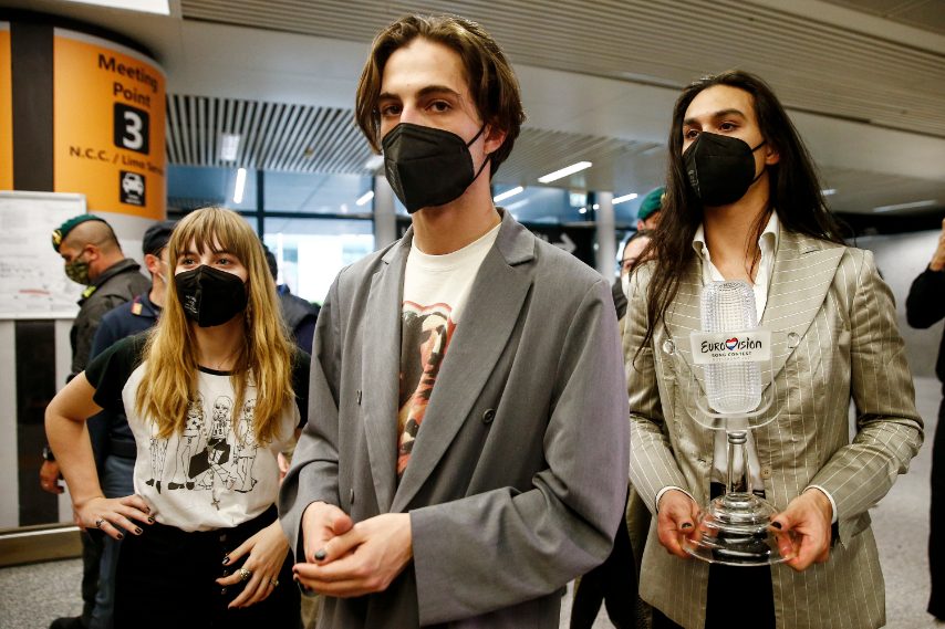 I Maneskin sono tornati in Italia dopo aver trionfato all'Eurovision Song Contest 2021 con la loro "Zitti e buoni". Dopo aver spopolato con i look metallizzati sfoggiati sul palco di Rotterdam, questa volta hanno preferito degli accessori "autoreferenziali". Damiano e Vittoria sono apparsi più glamour che mai con indosso delle t-shirt con le foto della band stampate sul petto.