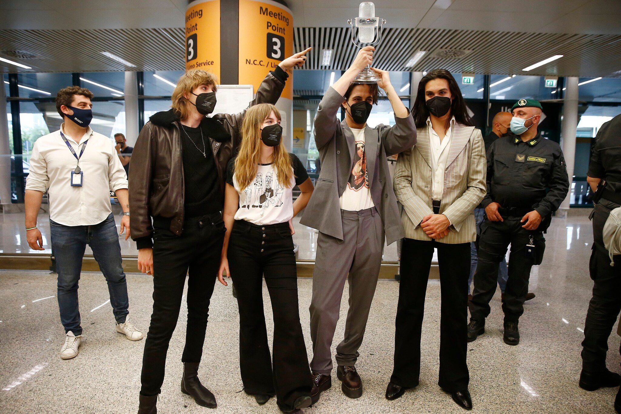 I Maneskin sono tornati in Italia dopo aver trionfato all'Eurovision Song Contest 2021 con la loro "Zitti e buoni". Dopo aver spopolato con i look metallizzati sfoggiati sul palco di Rotterdam, questa volta hanno preferito degli accessori "autoreferenziali". Damiano e Vittoria sono apparsi più glamour che mai con indosso delle t-shirt con le foto della band stampate sul petto.