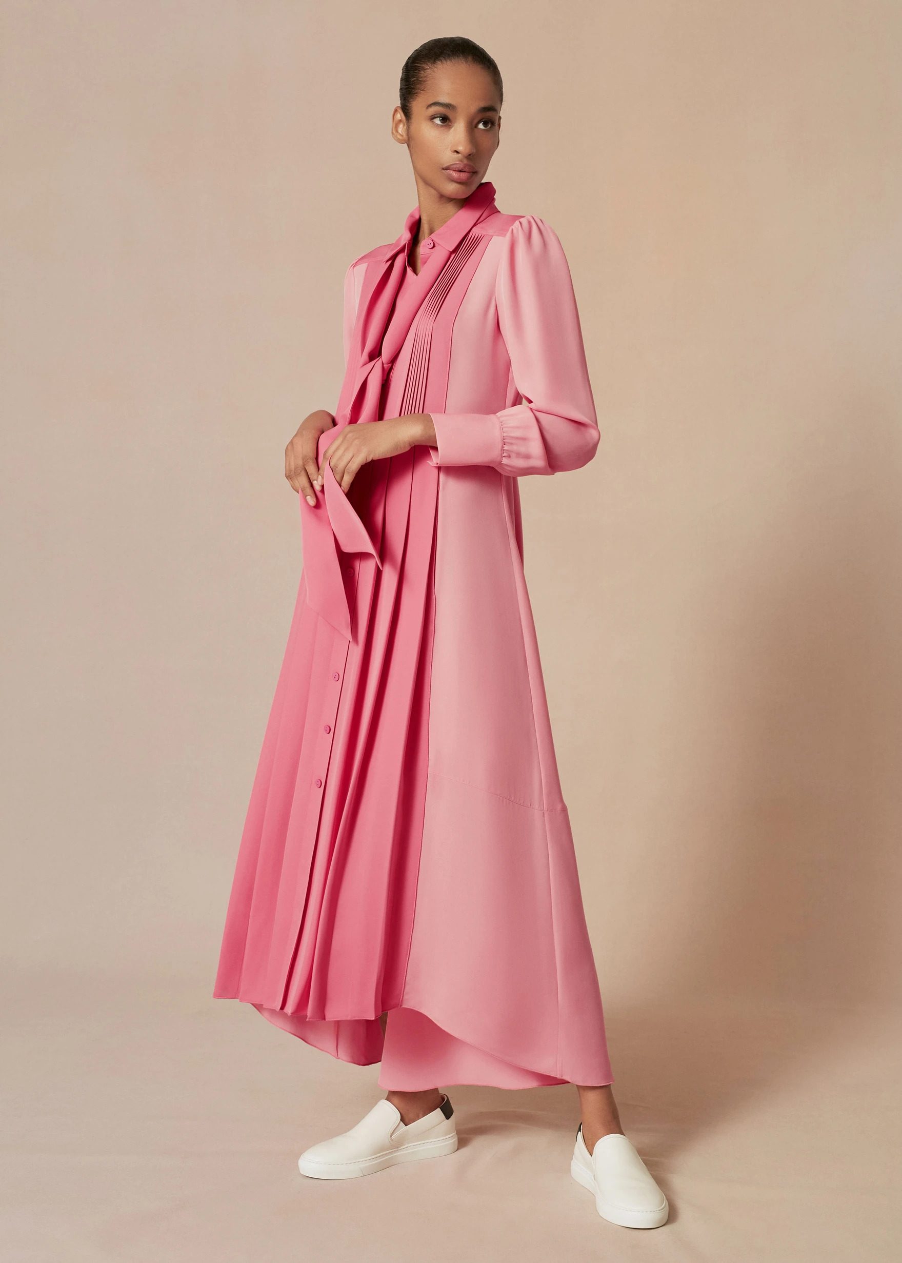 Kate Middleton ha conosciuto di persona la piccola Mila Sneddon, bambina di 5 anni malata di cancro con cui aveva avuto modo di avere uno scambio telefonico. In quell'occasione la bimba le aveva detto di avere una predilezione per il colore rosa e di amare molto i vestiti da principessa. La duchessa le aveva fatto quindi una promessa: in occasione del loro incontro ne avrebbe indossato uno, solo per lei. E così ha fatto. La scelta è caduta su un lungo abito chemisier plissettato completamente pink, firmato ME + EM (615 euro). Lo ha abbinato a una micro cintura tono su tono, a una mascherina floreale di Amaia Kids e a un paio di décolleté pastello di Emmy London, completando il tutto con degli orecchini a goccia di Missoma.