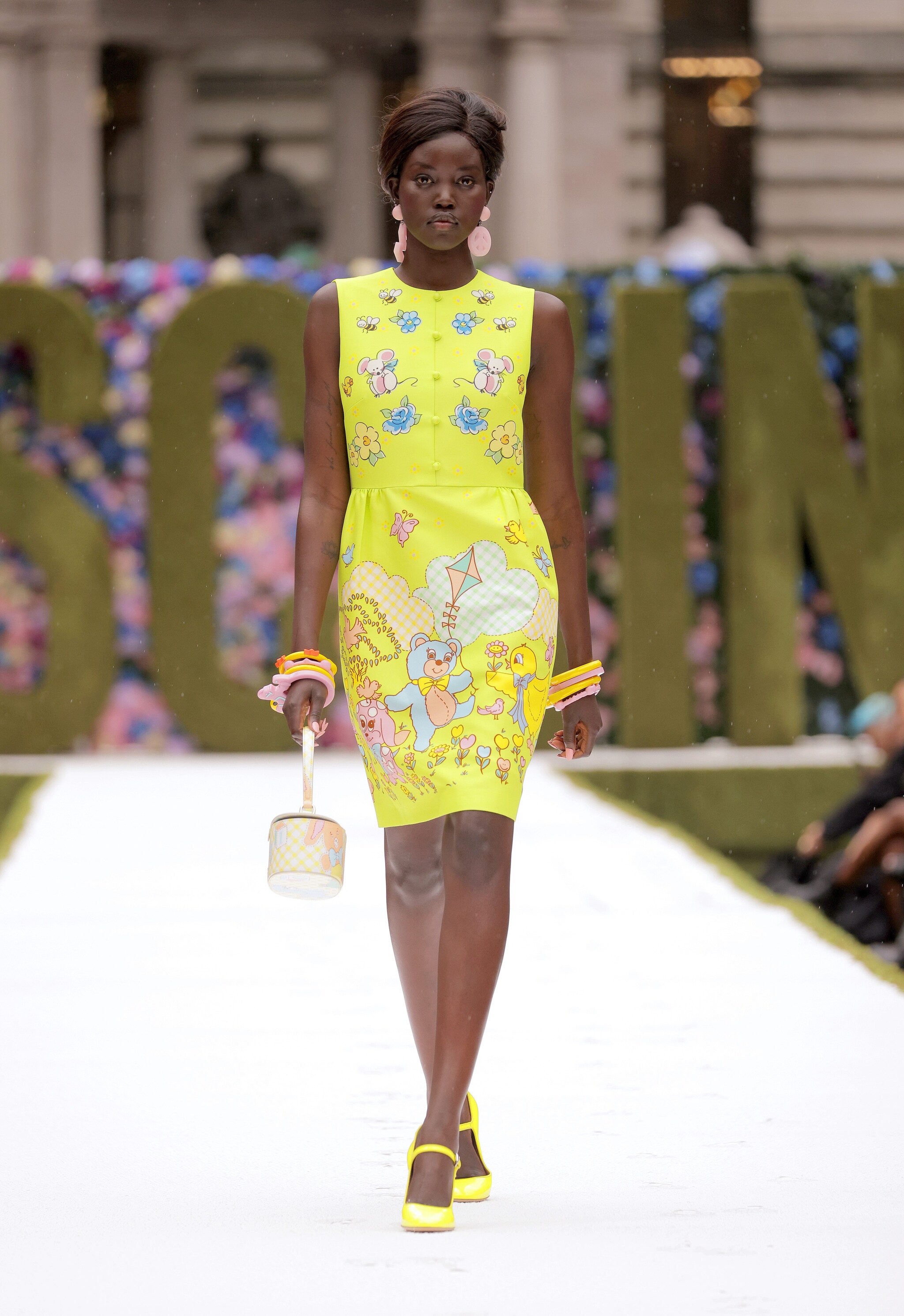 Moschino ha presentato la collezione Primavera/Estate 2022 durante la New York Fashion Week e ha letteralmente portato l'arcobaleno in una giornata uggiosa. Jeremy Scott ha puntato tutto su dei look cartoon giocosi e colorati: tra unicorni, fiocchi, occhiali a cuore, loghi in pvc variopinto, la sfilata è stata un continuo rimando alla fanciullezza, alla maternità e all'empowerment femminile.