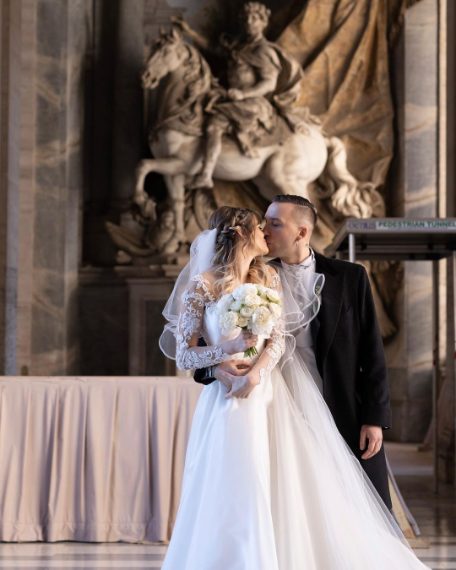 Briga e Arianna Montefiori si sono sposati, hanno pronunciato il fatidico sì nella chiesa di San Pietro, a Roma, dando vita a una cerimonia da sogno. L'ex cantante di Amici è apparso elegantissimo in uno smoking firmato I sarti italiani, mentre la moglie ha puntato su due diversi look principeschi e total white firmati Atelier Emé.