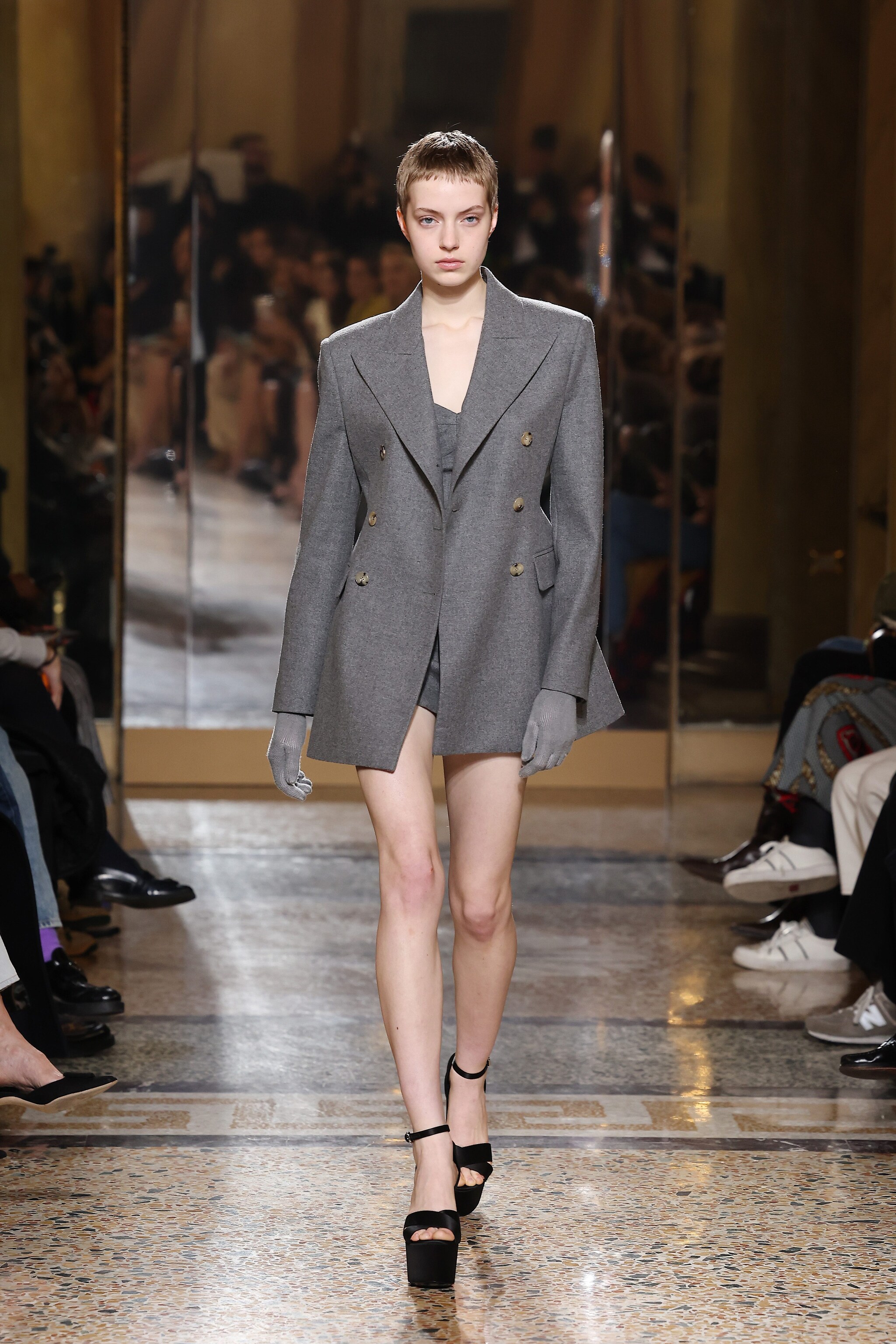 Mini abiti con rouches e cristalli, lingerie in pizzo, giacche in pelle e lunghi cappotti in lana pettinata effetto furry sfilano sulla passerella di Ermanno Scervino per la collezione Autunno/Inverno 2023-24.