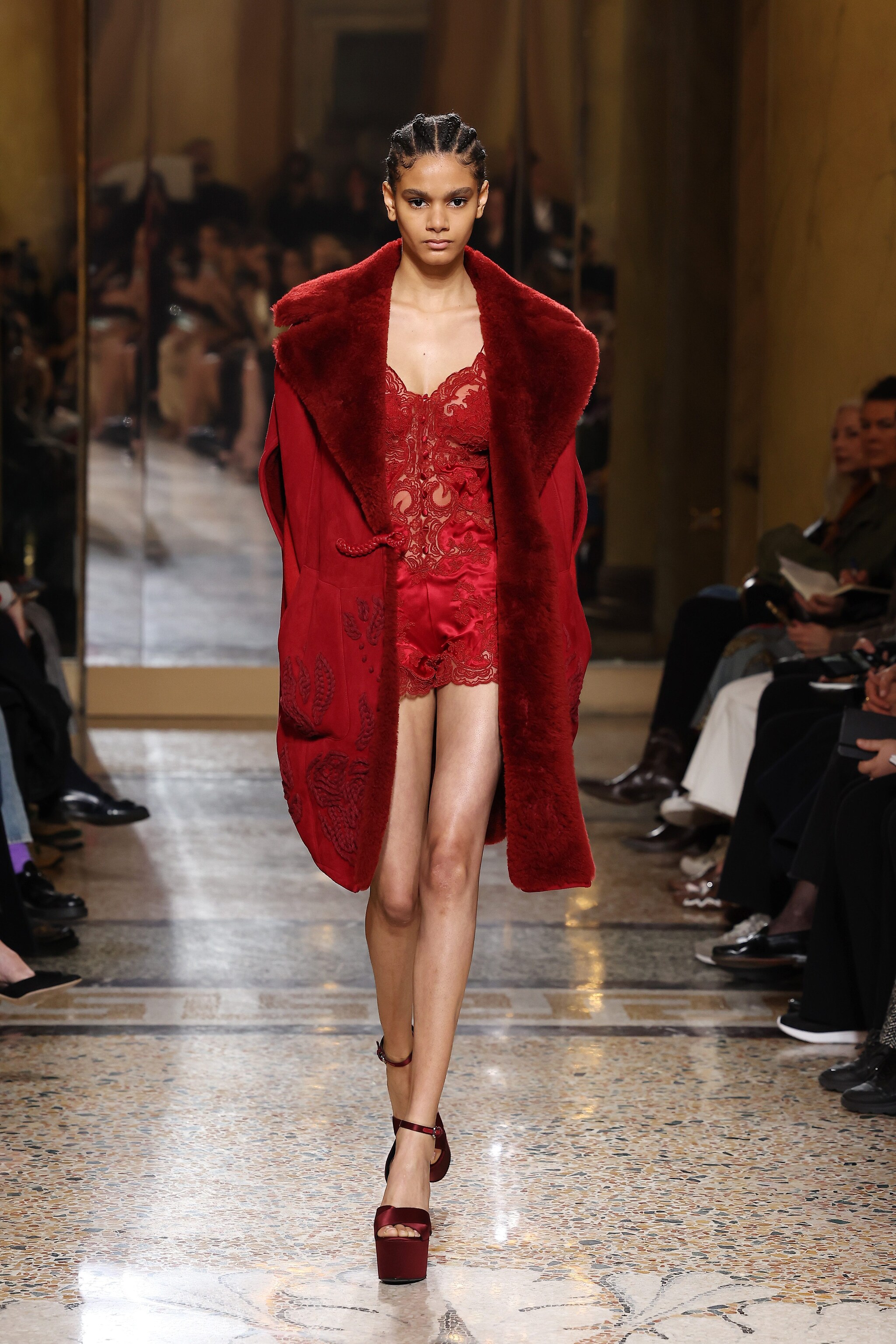 Mini abiti con rouches e cristalli, lingerie in pizzo, giacche in pelle e lunghi cappotti in lana pettinata effetto furry sfilano sulla passerella di Ermanno Scervino per la collezione Autunno/Inverno 2023-24.
