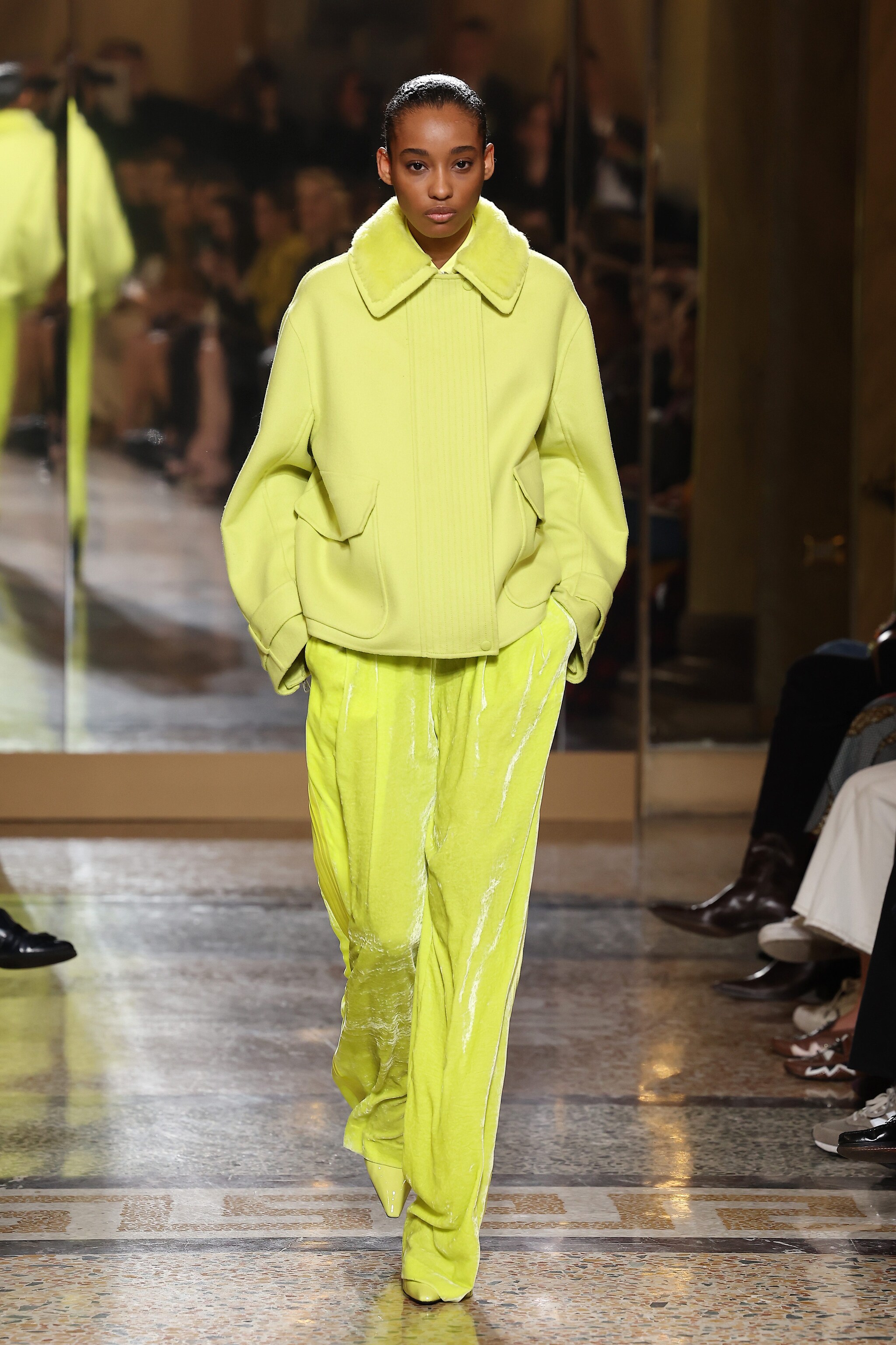 Mini abiti con rouches e cristalli, lingerie in pizzo, giacche in pelle e lunghi cappotti in lana pettinata effetto furry sfilano sulla passerella di Ermanno Scervino per la collezione Autunno/Inverno 2023-24.