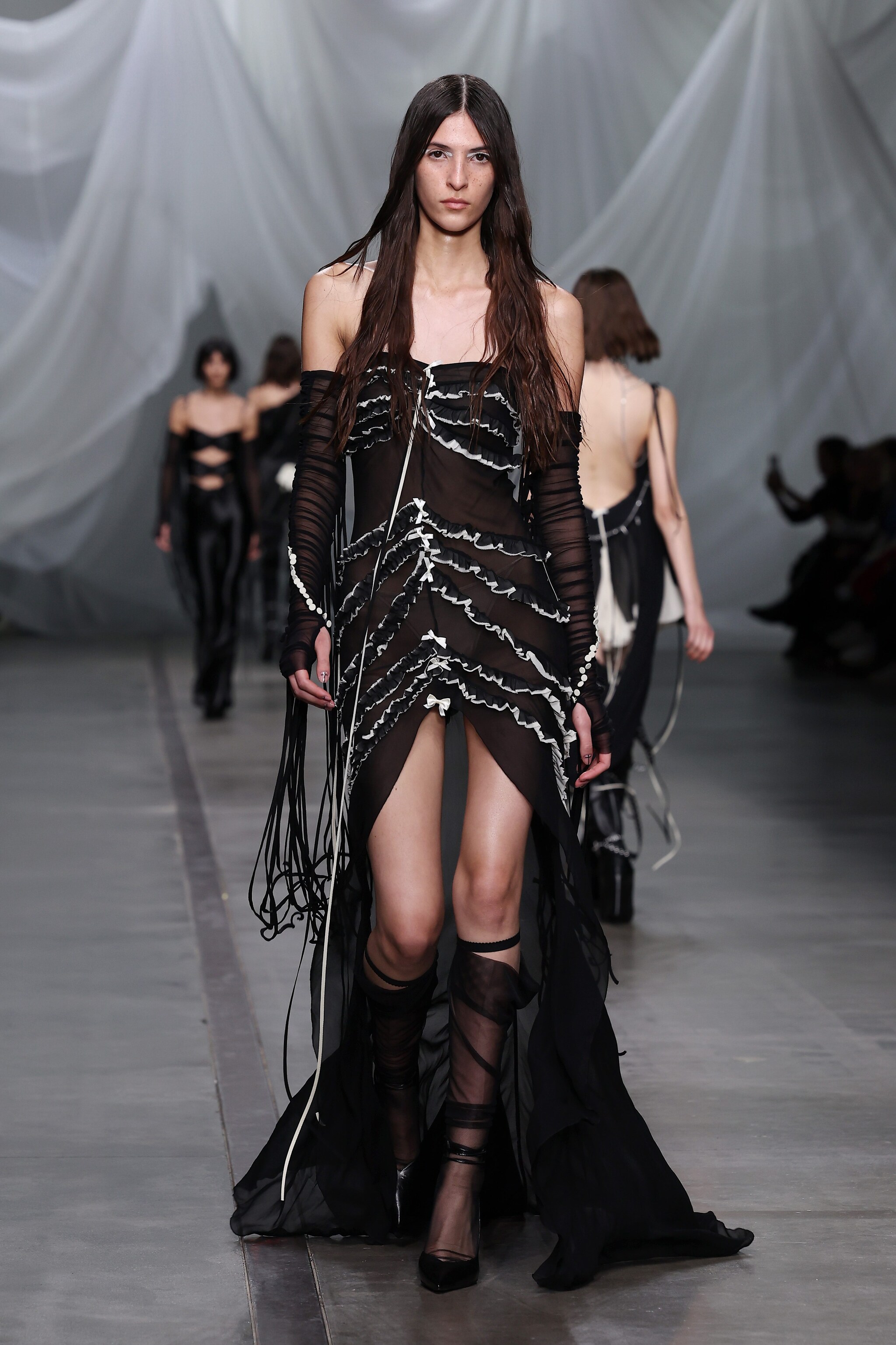 Candidi abiti destrutturati, maxi stivali, cappotti a pelo lungo e tute aderenti sfilano sulla passerella Autunno/Inverno 2023-24 di Aniye Records.