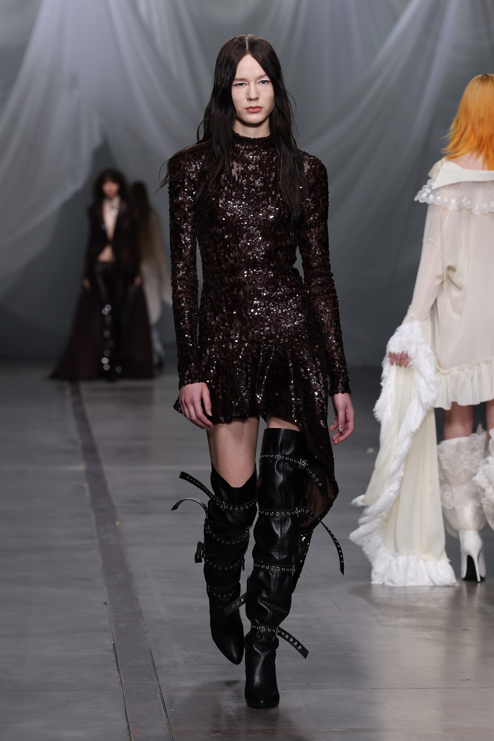 Candidi abiti destrutturati, maxi stivali, cappotti a pelo lungo e tute aderenti sfilano sulla passerella Autunno/Inverno 2023-24 di