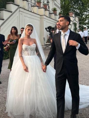 L'influencer Chiara Nasti e il calciatore Mattia Zaccagni si sono sposati a Roma: per l'occasione la sposa ha sfoggiato tre abiti diversi, dal pizzo romantico per la cerimonia alla minigonna drappeggiata per la festa.