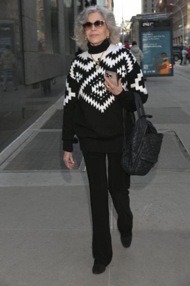 Jane Fonda con maglione Canada Goose by Haider Ackermann.