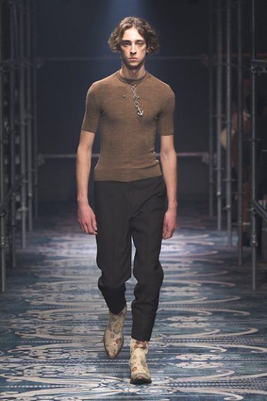 Alla Milano Fashion Week, sulla passerella uomo Autunno/Inverno 2025-2026 di Prada, le stampe check e tartan, i colori pastello e le linee asciutte si mescolano con patchwork di pelliccia, frange, completi in pelle e boots da cowboy, tutti dettagli che citano in maniera ironica lo stile texano creando un crash di stili opposti