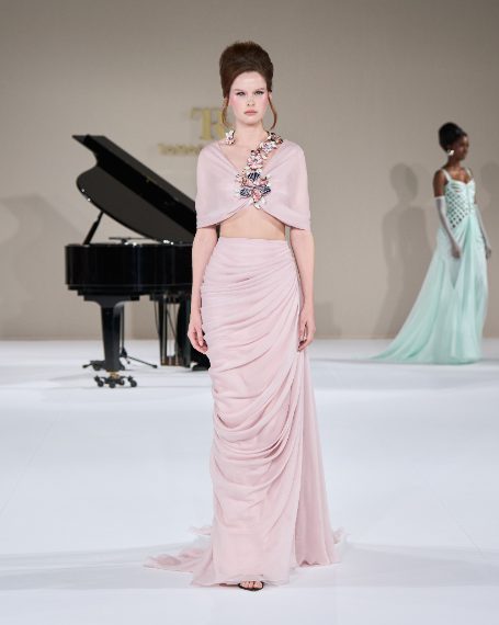 Drappeggi nel tessuto, maxi fiocchi, cascate di perle e nuance pastello accostate al nero sfilano alla Paris Fashion Week sulla passerella Haute Couture Primavera/Estate 2025 di Tamara Ralph
