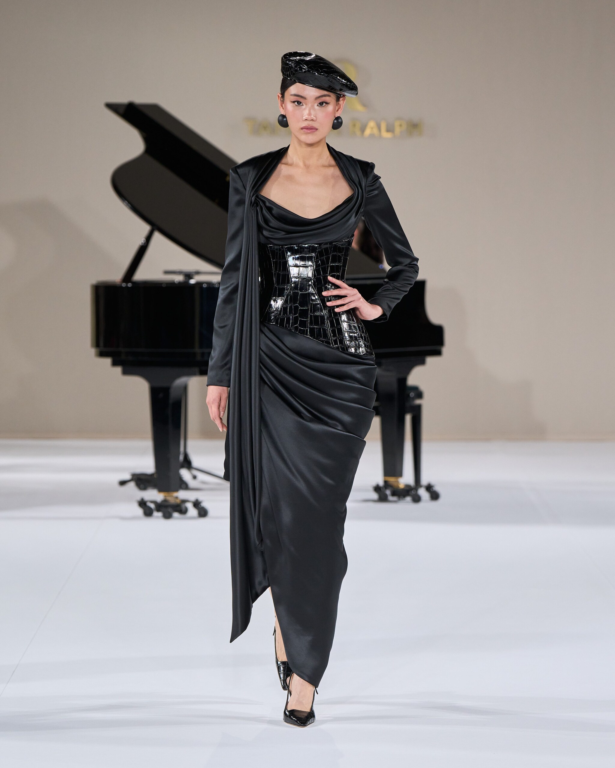 Drappeggi nel tessuto, maxi fiocchi, cascate di perle e nuance pastello accostate al nero sfilano alla Paris Fashion Week sulla passerella Haute Couture Primavera/Estate 2025 di Tamara Ralph