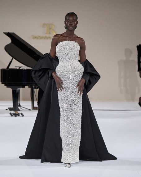 Drappeggi nel tessuto, maxi fiocchi, cascate di perle e nuance pastello accostate al nero sfilano alla Paris Fashion Week sulla passerella Haute Couture Primavera/Estate 2025 di Tamara Ralph