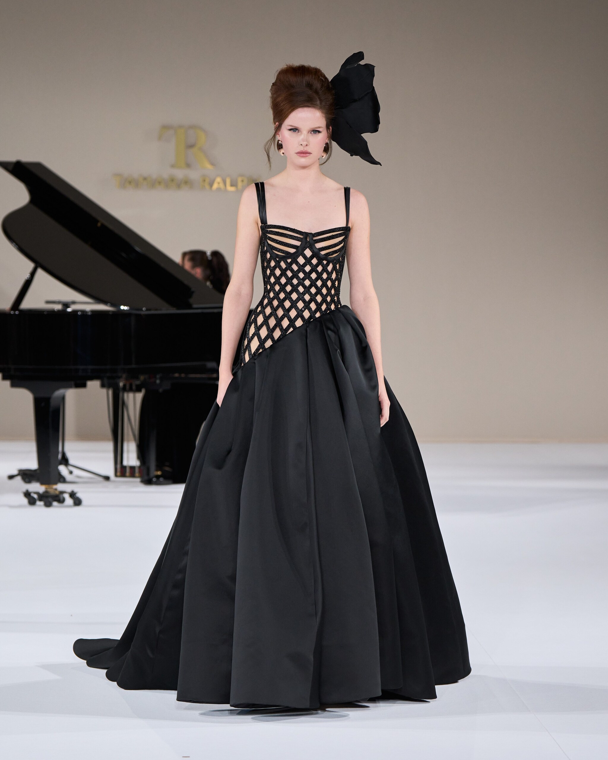 Drappeggi nel tessuto, maxi fiocchi, cascate di perle e nuance pastello accostate al nero sfilano alla Paris Fashion Week sulla passerella Haute Couture Primavera/Estate 2025 di Tamara Ralph