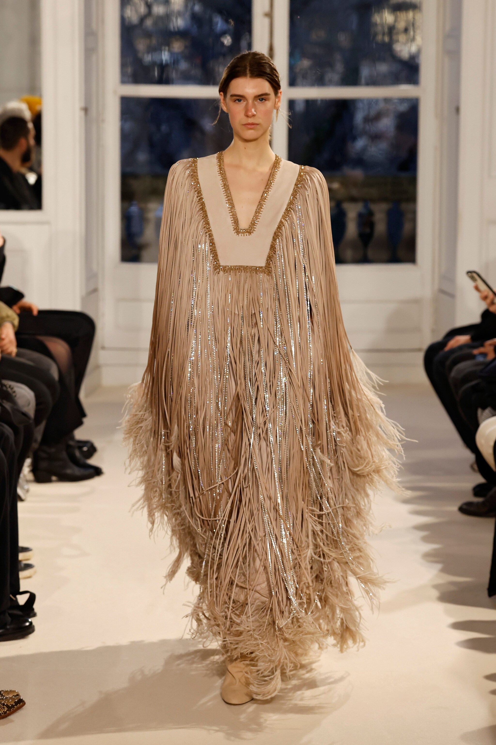 Abiti tulipano e morbidi vestiti mono spalla, look total black o illuminati con cristalli rosa, cascate di frange e pantaloni in velluto sfilano nella collezione Haute Couture Primavera/Estate 2025 di Alexandre Vauthier alla Paris Fashion Week