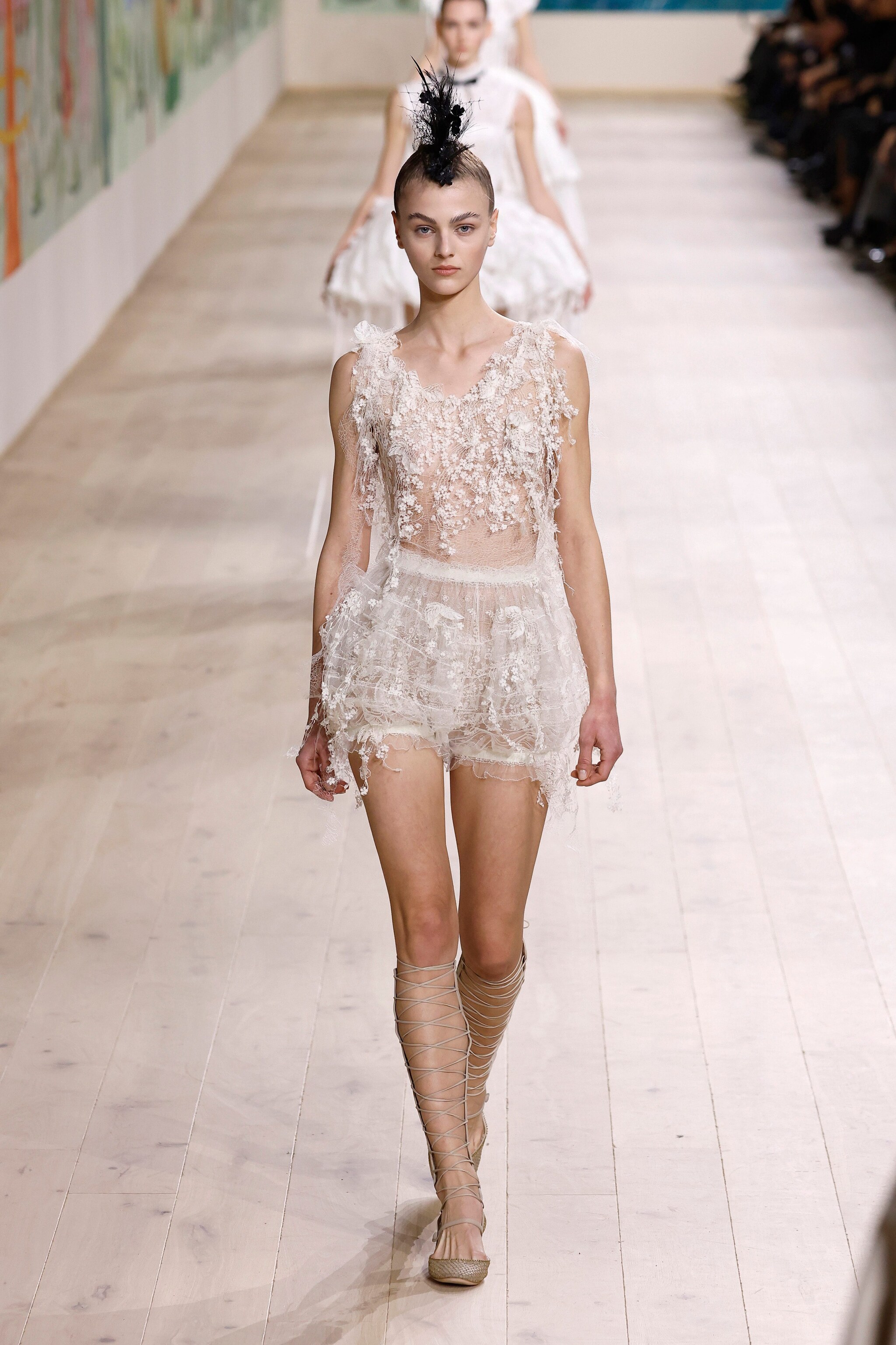 Ricami floreali che sembrano spuntare dal tessuto, gonne simili a gabbie, vaporosi abiti con ruche in tulle e decori con cristalli sfilano alla Paris Fashion Week sulla passerella Haute Couture Primavera/Estate 2025 di Dior.