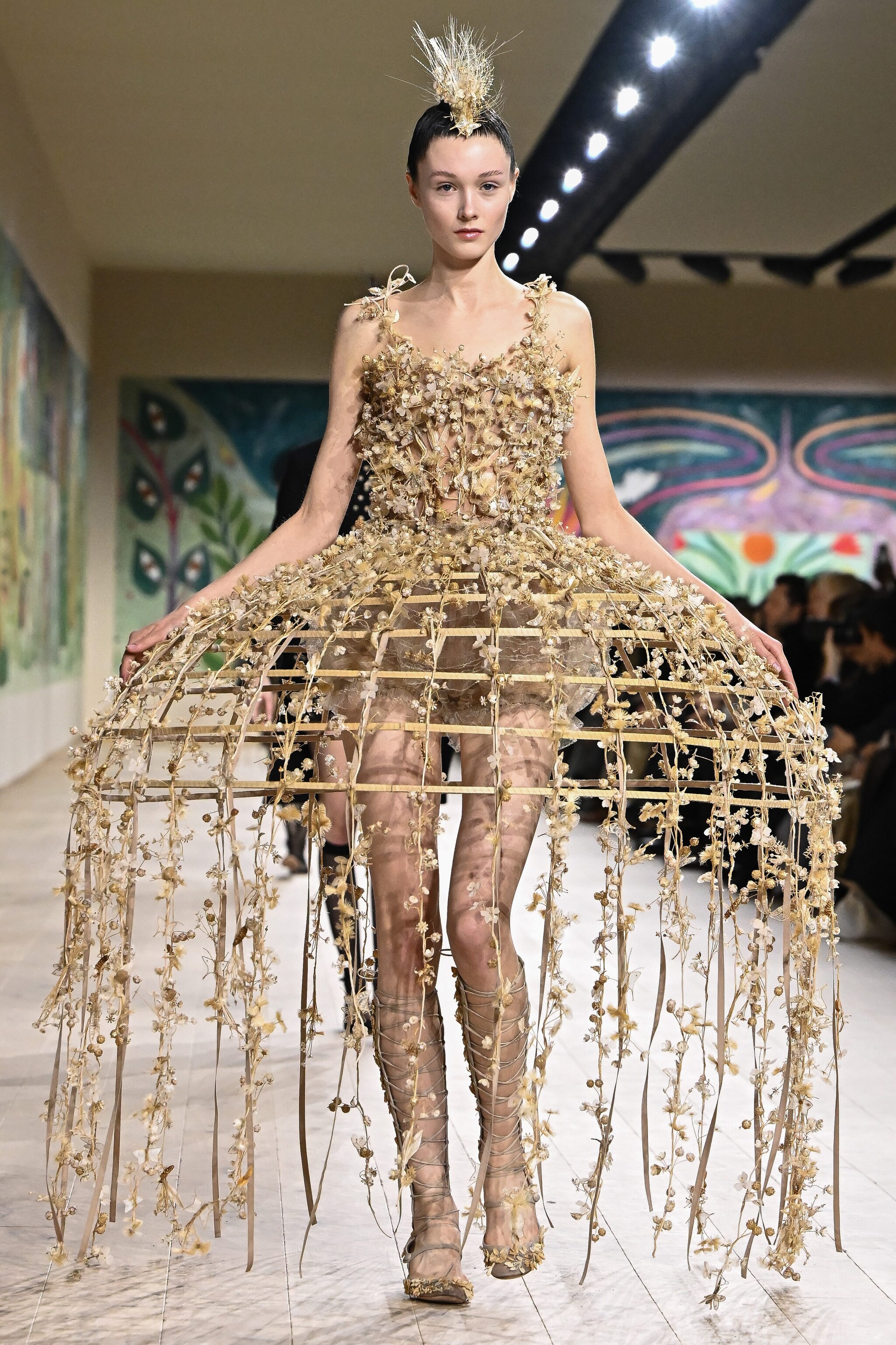 Ricami floreali che sembrano spuntare dal tessuto, gonne simili a gabbie, vaporosi abiti con ruche in tulle e decori con cristalli sfilano alla Paris Fashion Week sulla passerella Haute Couture Primavera/Estate 2025 di Dior.