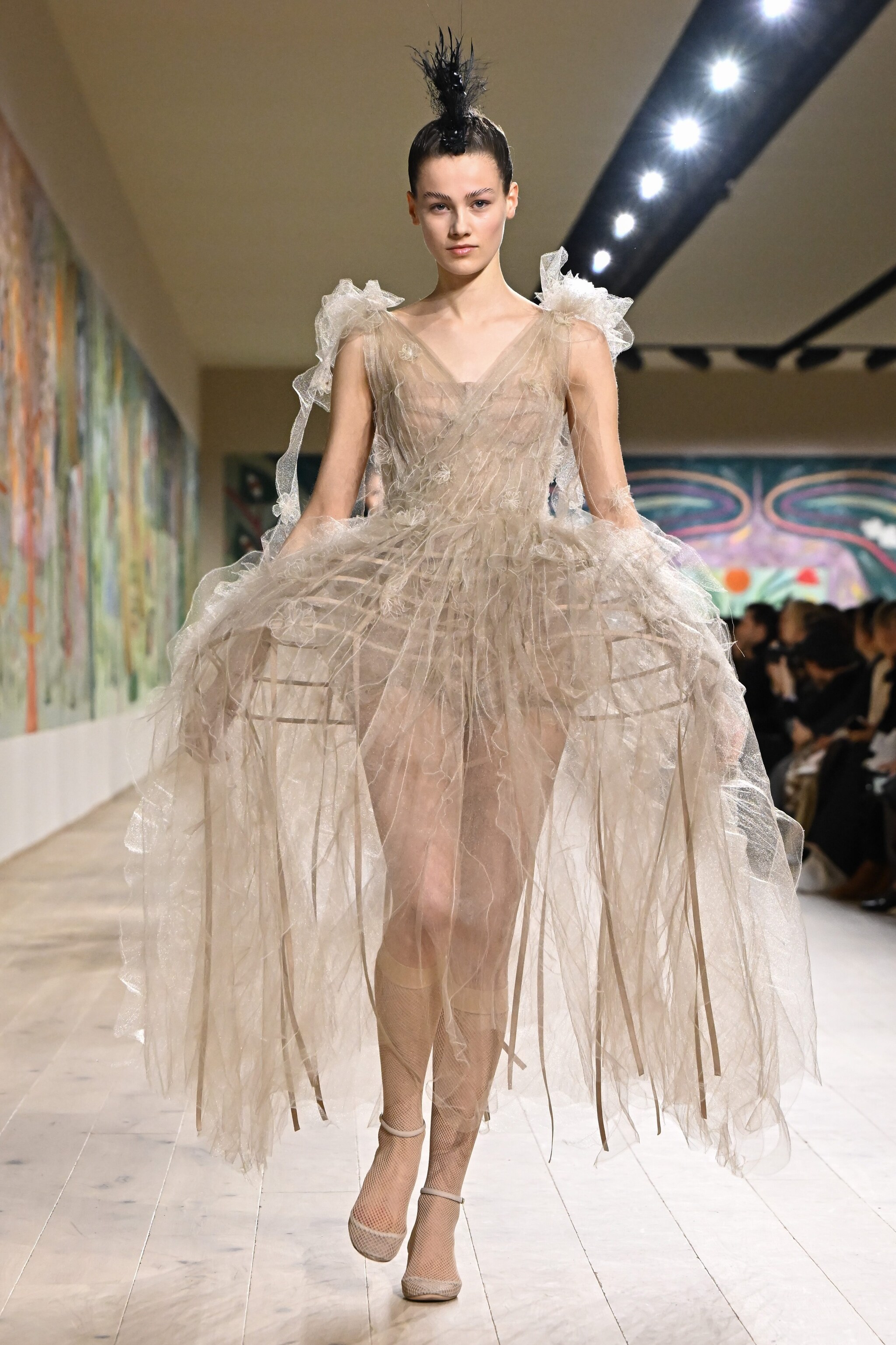 Ricami floreali che sembrano spuntare dal tessuto, gonne simili a gabbie, vaporosi abiti con ruche in tulle e decori con cristalli sfilano alla Paris Fashion Week sulla passerella Haute Couture Primavera/Estate 2025 di Dior.