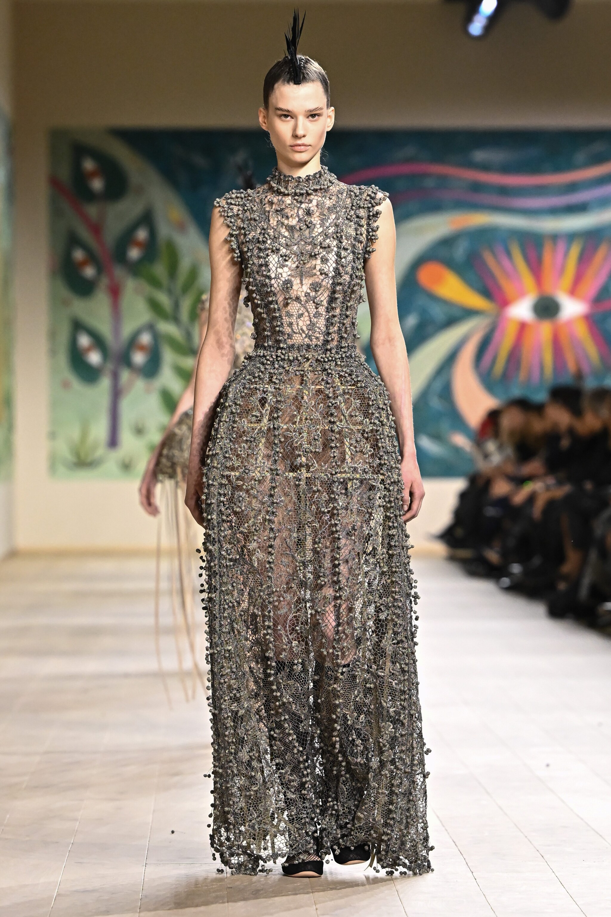 Ricami floreali che sembrano spuntare dal tessuto, gonne simili a gabbie, vaporosi abiti con ruche in tulle e decori con cristalli sfilano alla Paris Fashion Week sulla passerella Haute Couture Primavera/Estate 2025 di Dior.