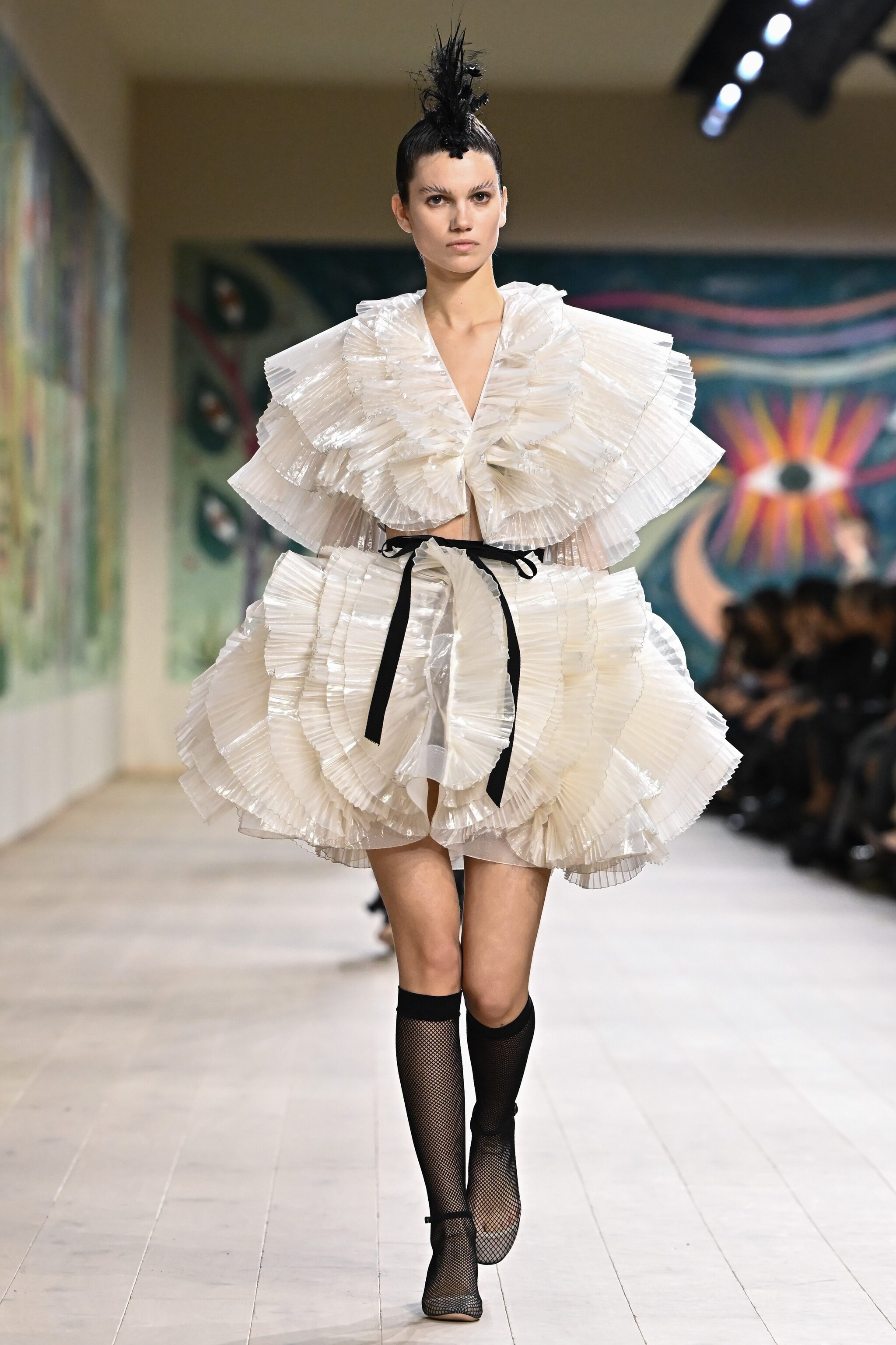 Ricami floreali che sembrano spuntare dal tessuto, gonne simili a gabbie, vaporosi abiti con ruche in tulle e decori con cristalli sfilano alla Paris Fashion Week sulla passerella Haute Couture Primavera/Estate 2025 di Dior.
