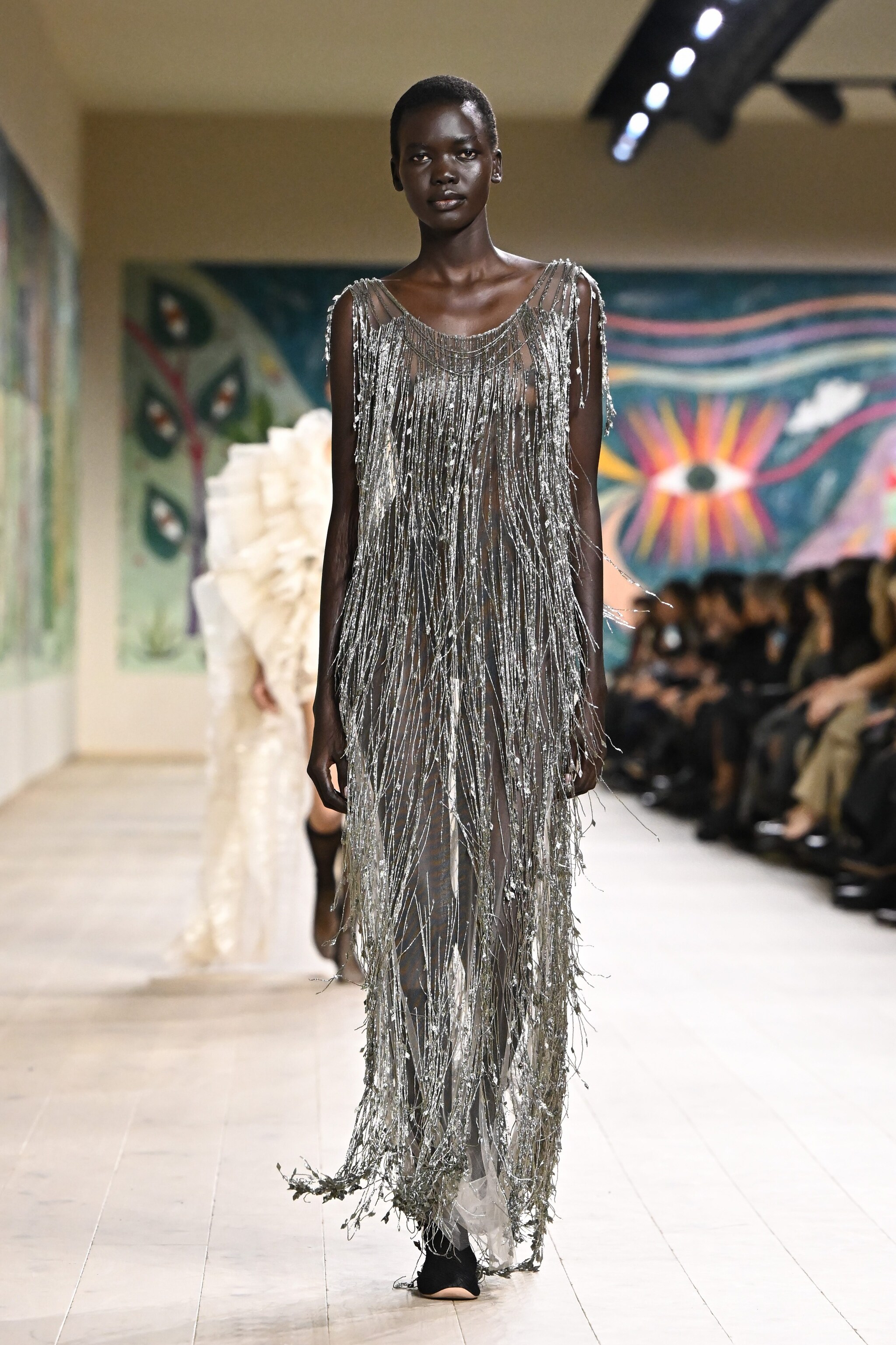 Ricami floreali che sembrano spuntare dal tessuto, gonne simili a gabbie, vaporosi abiti con ruche in tulle e decori con cristalli sfilano alla Paris Fashion Week sulla passerella Haute Couture Primavera/Estate 2025 di Dior.