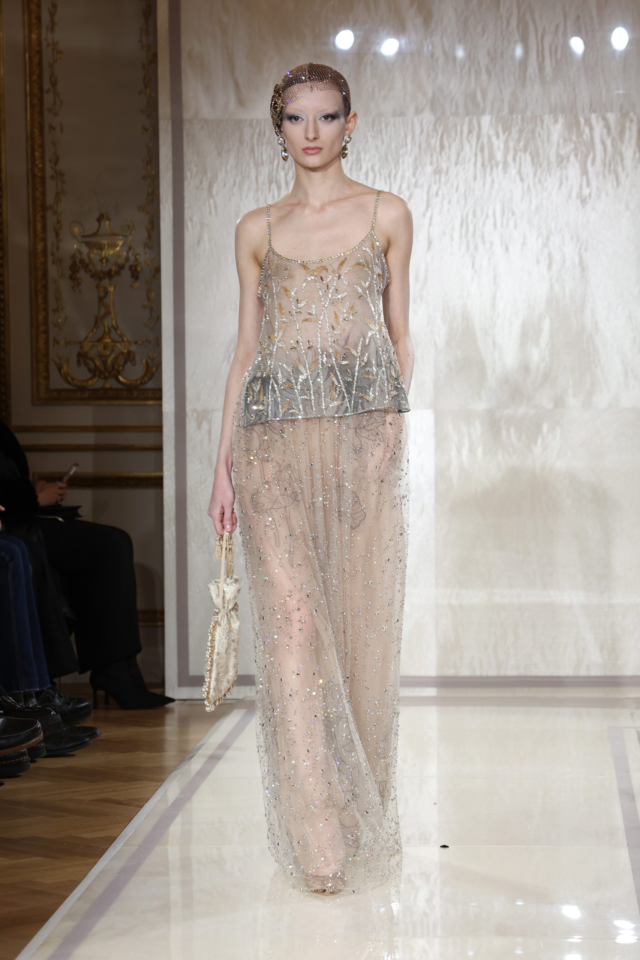 Colori tenui, tessuti impalpabili, ricami preziosi realizzati con cristalli, pietre e paillettes sfilano alla Paris Fashion week sulla passerella Haute Couture Primavera/Estate 2025 di Giorgio Armani Privé