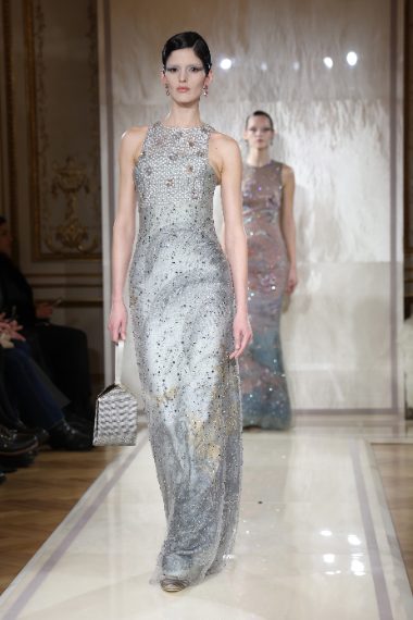 Colori tenui, tessuti impalpabili, ricami preziosi realizzati con cristalli, pietre e paillettes sfilano alla Paris Fashion week sulla passerella Haute Couture Primavera/Estate 2025 di Giorgio Armani Privé