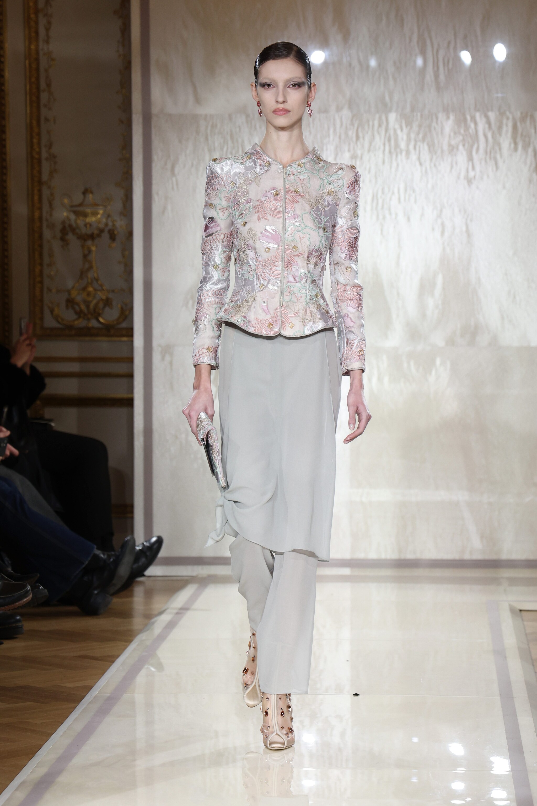 Colori tenui, tessuti impalpabili, ricami preziosi realizzati con cristalli, pietre e paillettes sfilano alla Paris Fashion week sulla passerella Haute Couture Primavera/Estate 2025 di Giorgio Armani Privé