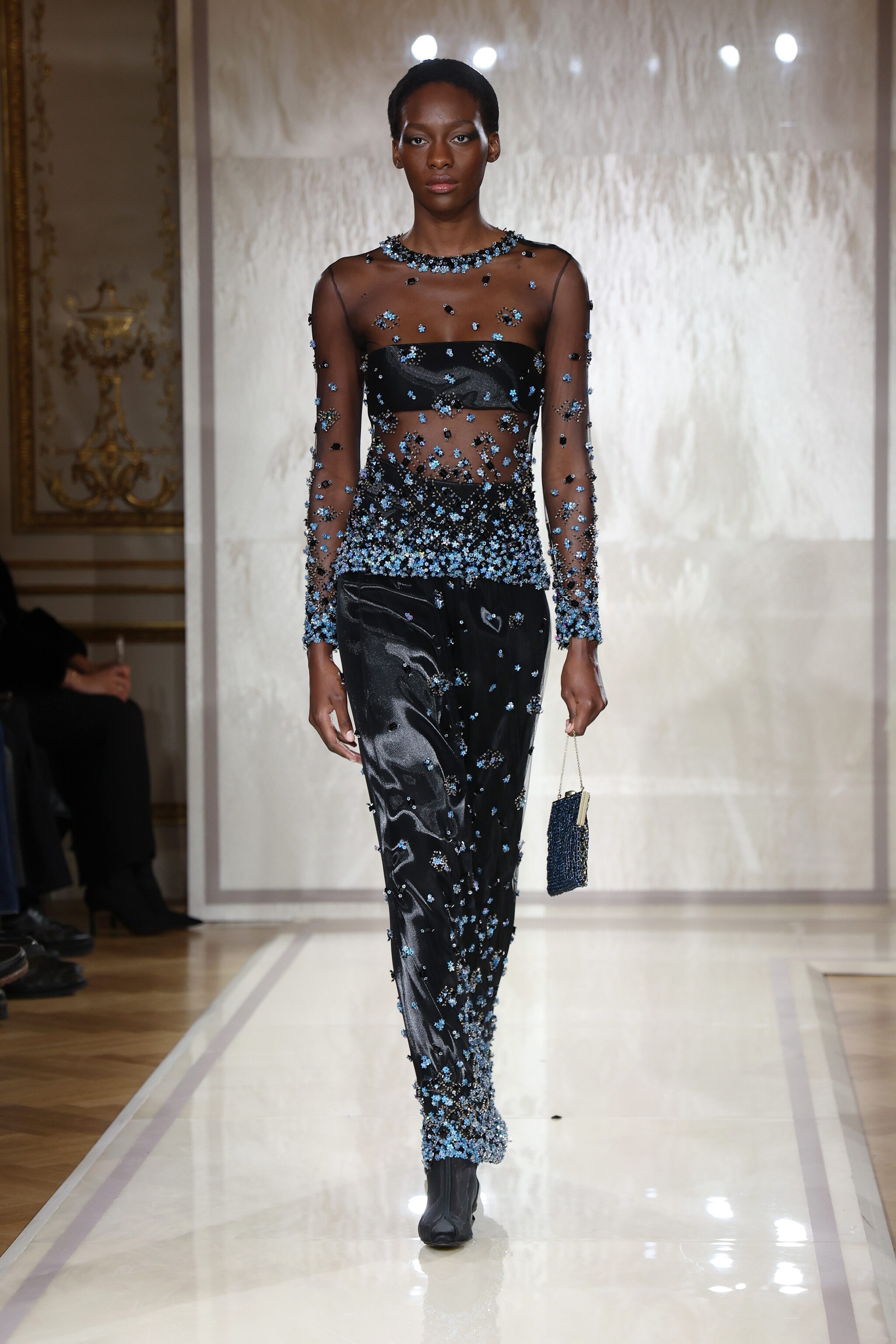 Colori tenui, tessuti impalpabili, ricami preziosi realizzati con cristalli, pietre e paillettes sfilano alla Paris Fashion week sulla passerella Haute Couture Primavera/Estate 2025 di Giorgio Armani Privé