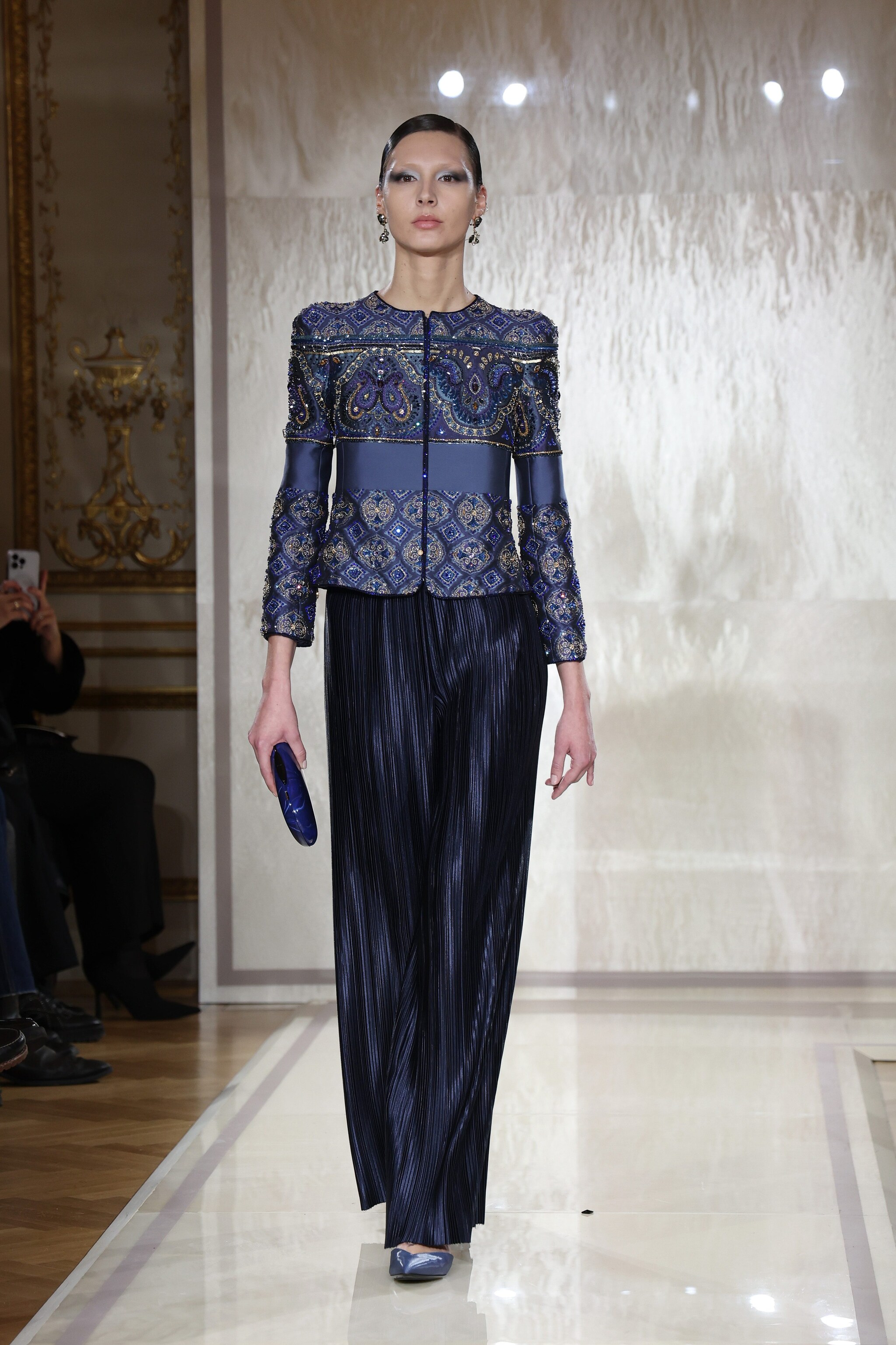 Colori tenui, tessuti impalpabili, ricami preziosi realizzati con cristalli, pietre e paillettes sfilano alla Paris Fashion week sulla passerella Haute Couture Primavera/Estate 2025 di Giorgio Armani Privé