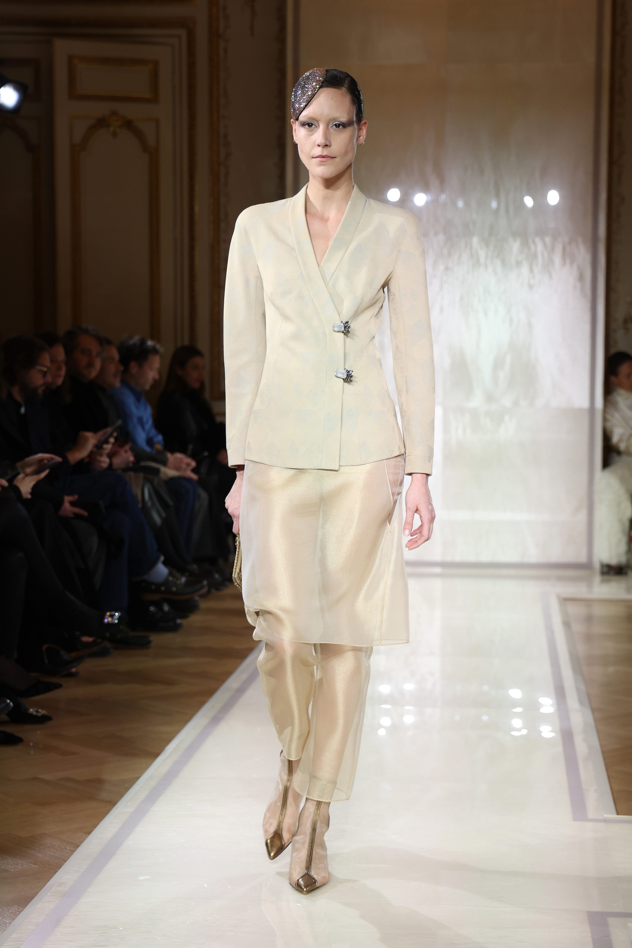 Colori tenui, tessuti impalpabili, ricami preziosi realizzati con cristalli, pietre e paillettes sfilano alla Paris Fashion week sulla passerella Haute Couture Primavera/Estate 2025 di Giorgio Armani Privé