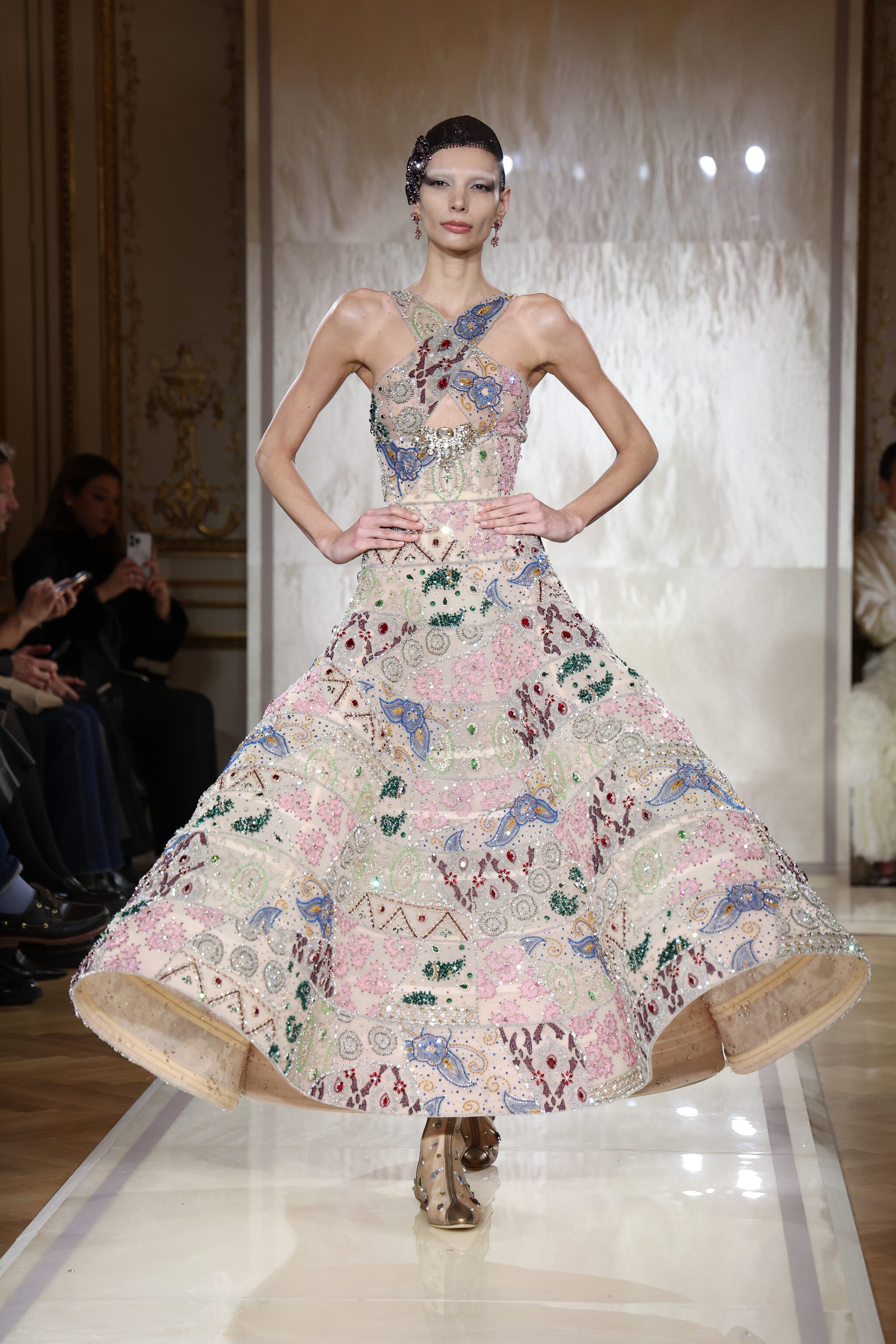 Colori tenui, tessuti impalpabili, ricami preziosi realizzati con cristalli, pietre e paillettes sfilano alla Paris Fashion week sulla passerella Haute Couture Primavera/Estate 2025 di Giorgio Armani Privé