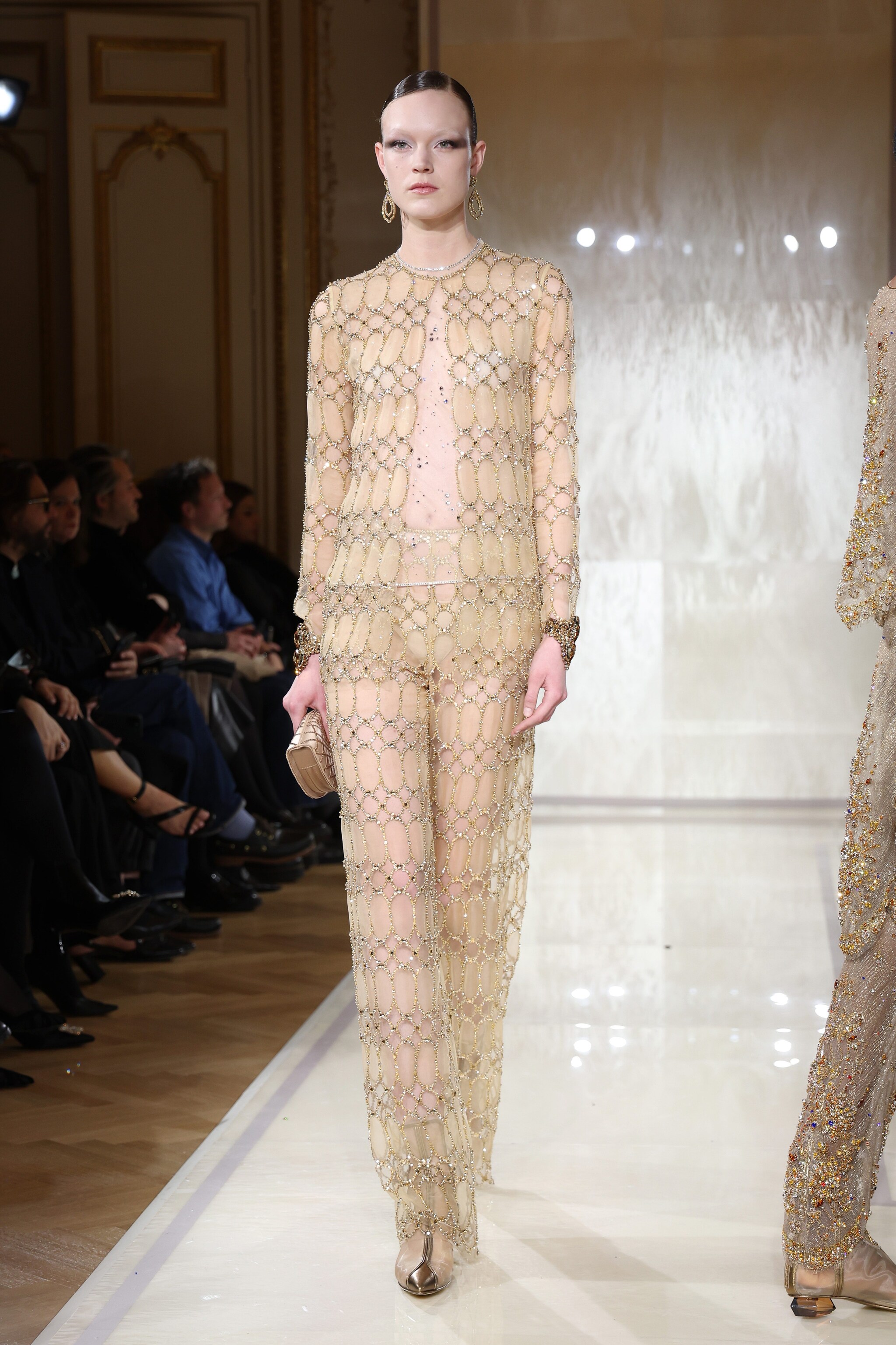 Colori tenui, tessuti impalpabili, ricami preziosi realizzati con cristalli, pietre e paillettes sfilano alla Paris Fashion week sulla passerella Haute Couture Primavera/Estate 2025 di Giorgio Armani Privé