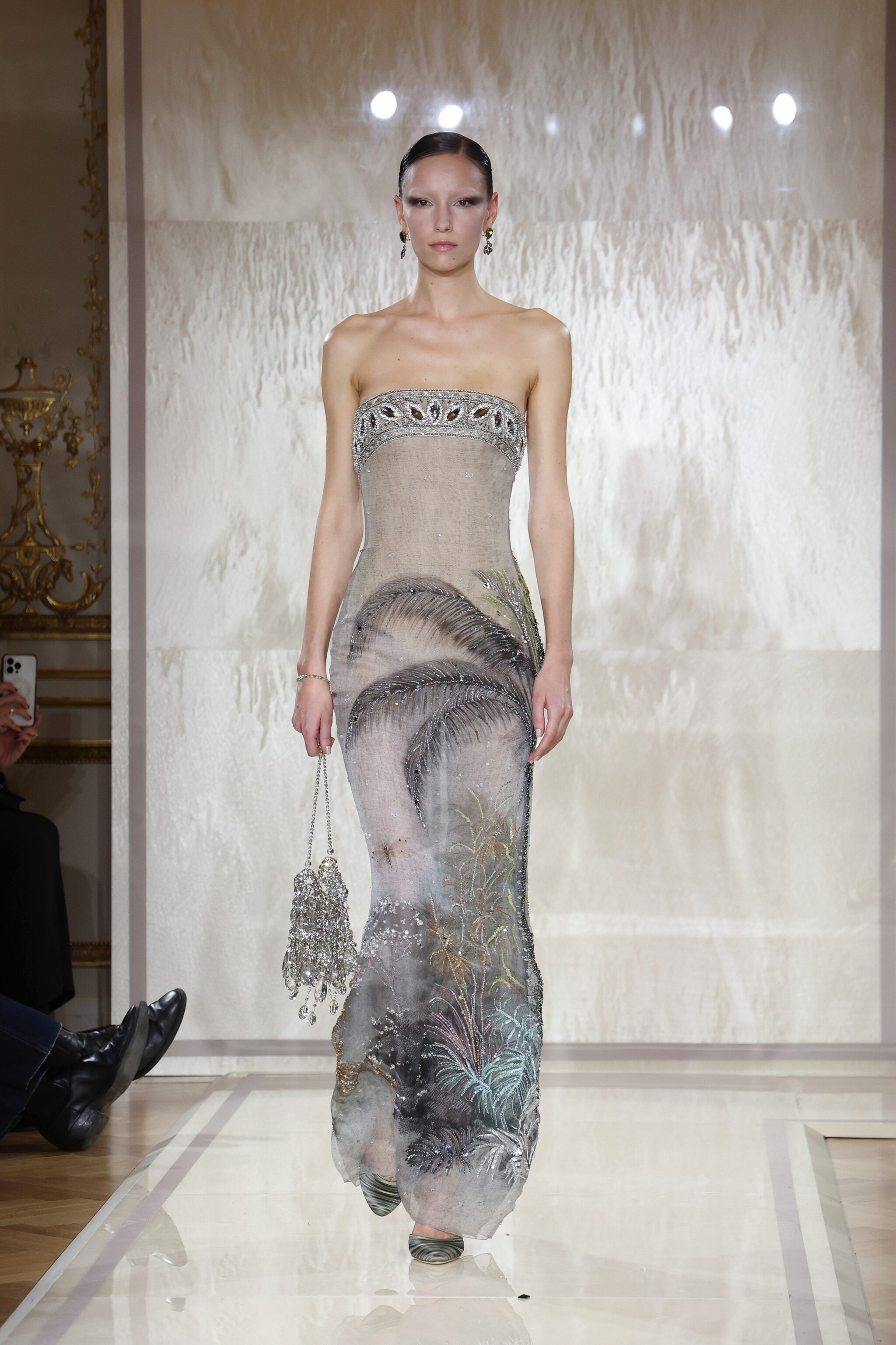 Colori tenui, tessuti impalpabili, ricami preziosi realizzati con cristalli, pietre e paillettes sfilano alla Paris Fashion week sulla passerella Haute Couture Primavera/Estate 2025 di Giorgio Armani Privé