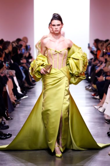Colori intensi come lime e blu elettrico, alternati a tonalità nude, cristalli e ricami sontuosi sfilano alla Paris Fashion Week sulla passerella Haute Couture Primavera/Estate 2025 di Elie Saab