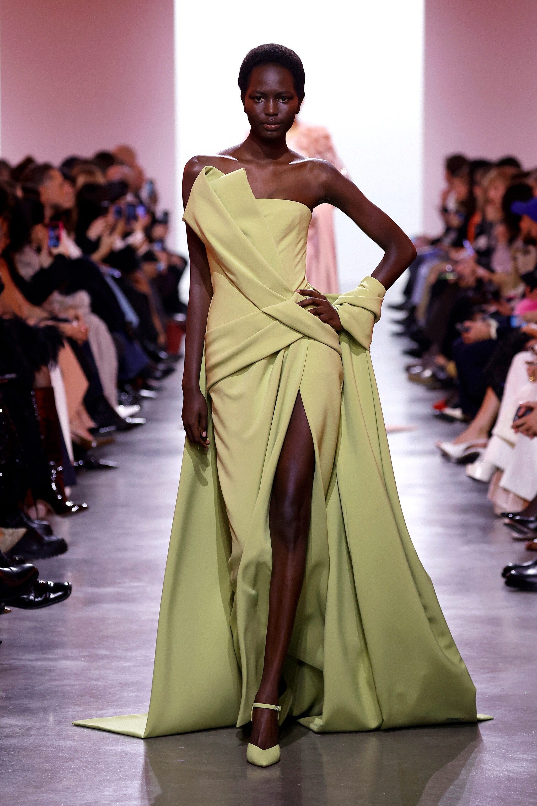 Colori intensi come lime e blu elettrico, alternati a tonalità nude, cristalli e ricami sontuosi sfilano alla Paris Fashion Week sulla passerella Haute Couture Primavera/Estate 2025 di Elie Saab