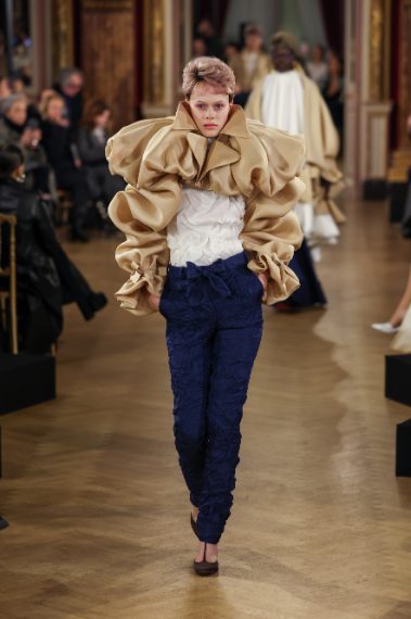 Enormi fiocchi, trench decostruiti, capi ricoperti da tessuti a onda, drappeggi e volumi maxi sfilano alla Paris Fashion Week sulla passerella Haute Couture Primavera/Estate 2025 di Viktor&Rolf