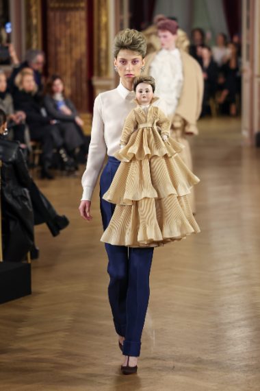 Enormi fiocchi, trench decostruiti, capi ricoperti da tessuti a onda, drappeggi e volumi maxi sfilano alla Paris Fashion Week sulla passerella Haute Couture Primavera/Estate 2025 di Viktor&Rolf