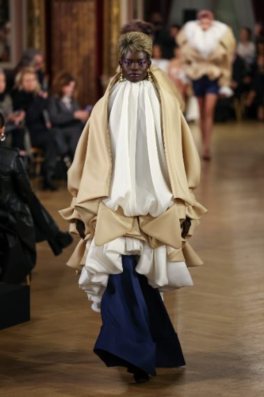 Enormi fiocchi, trench decostruiti, capi ricoperti da tessuti a onda, drappeggi e volumi maxi sfilano alla Paris Fashion Week sulla passerella Haute Couture Primavera/Estate 2025 di Viktor&Rolf