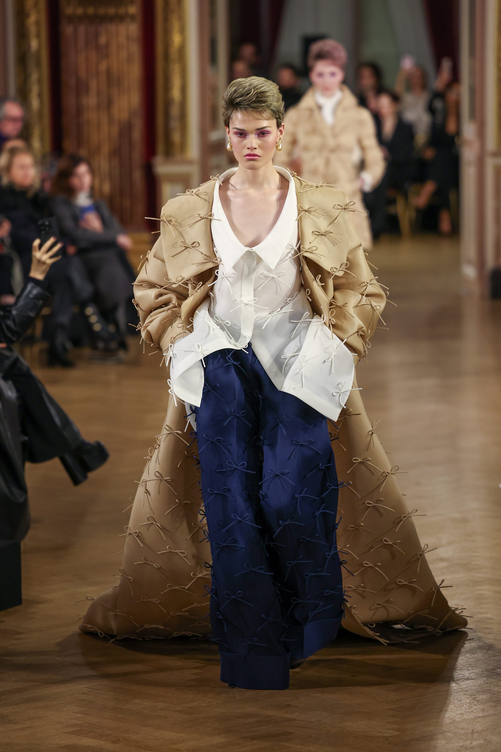Enormi fiocchi, trench decostruiti, capi ricoperti da tessuti a onda, drappeggi e volumi maxi sfilano alla Paris Fashion Week sulla passerella Haute Couture Primavera/Estate 2025 di Viktor&Rolf