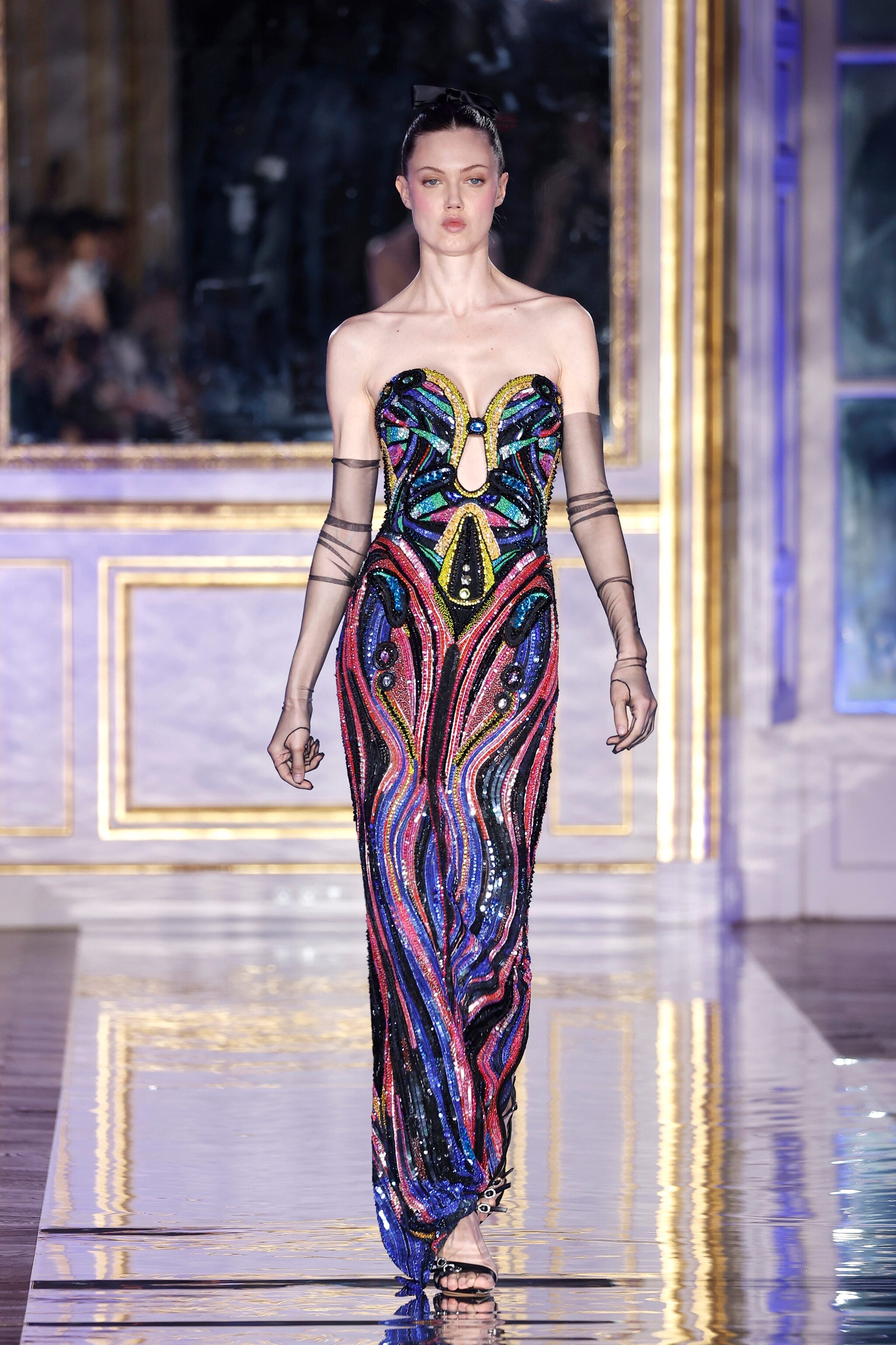 Colori accesi e tonalità pastello si mescolano con decori barocchi, drappeggi e cristalli sulla passerella Haute Couture Primavera/Estate 2025 di Zuhair Murad alla Paris Fashion Week