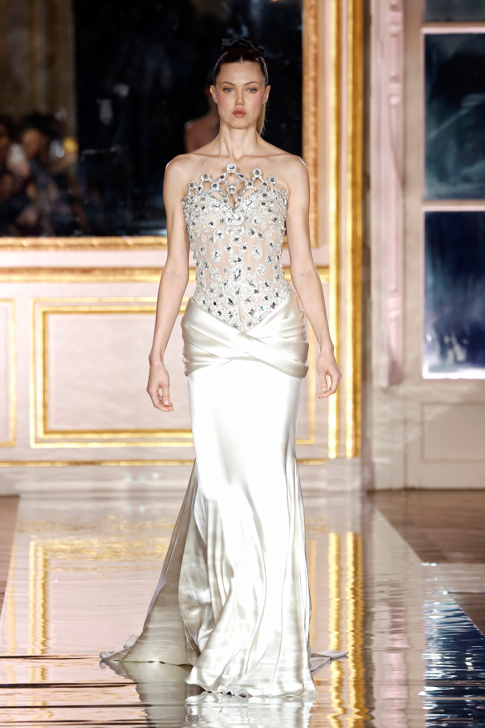 Colori accesi e tonalità pastello si mescolano con decori barocchi, drappeggi e cristalli sulla passerella Haute Couture Primavera/Estate 2025 di Zuhair Murad alla Paris Fashion Week