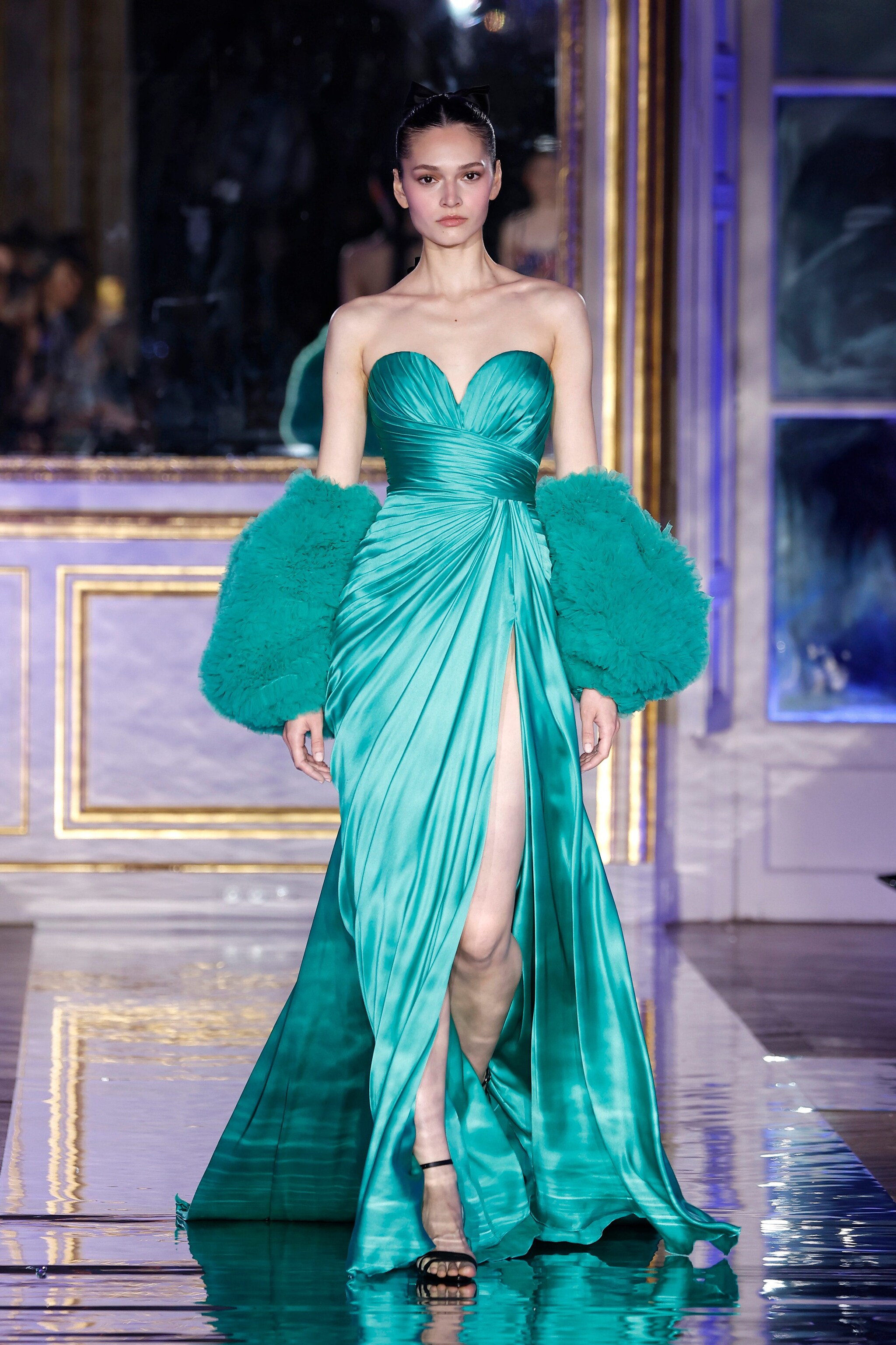 Colori accesi e tonalità pastello si mescolano con decori barocchi, drappeggi e cristalli sulla passerella Haute Couture Primavera/Estate 2025 di Zuhair Murad alla Paris Fashion Week