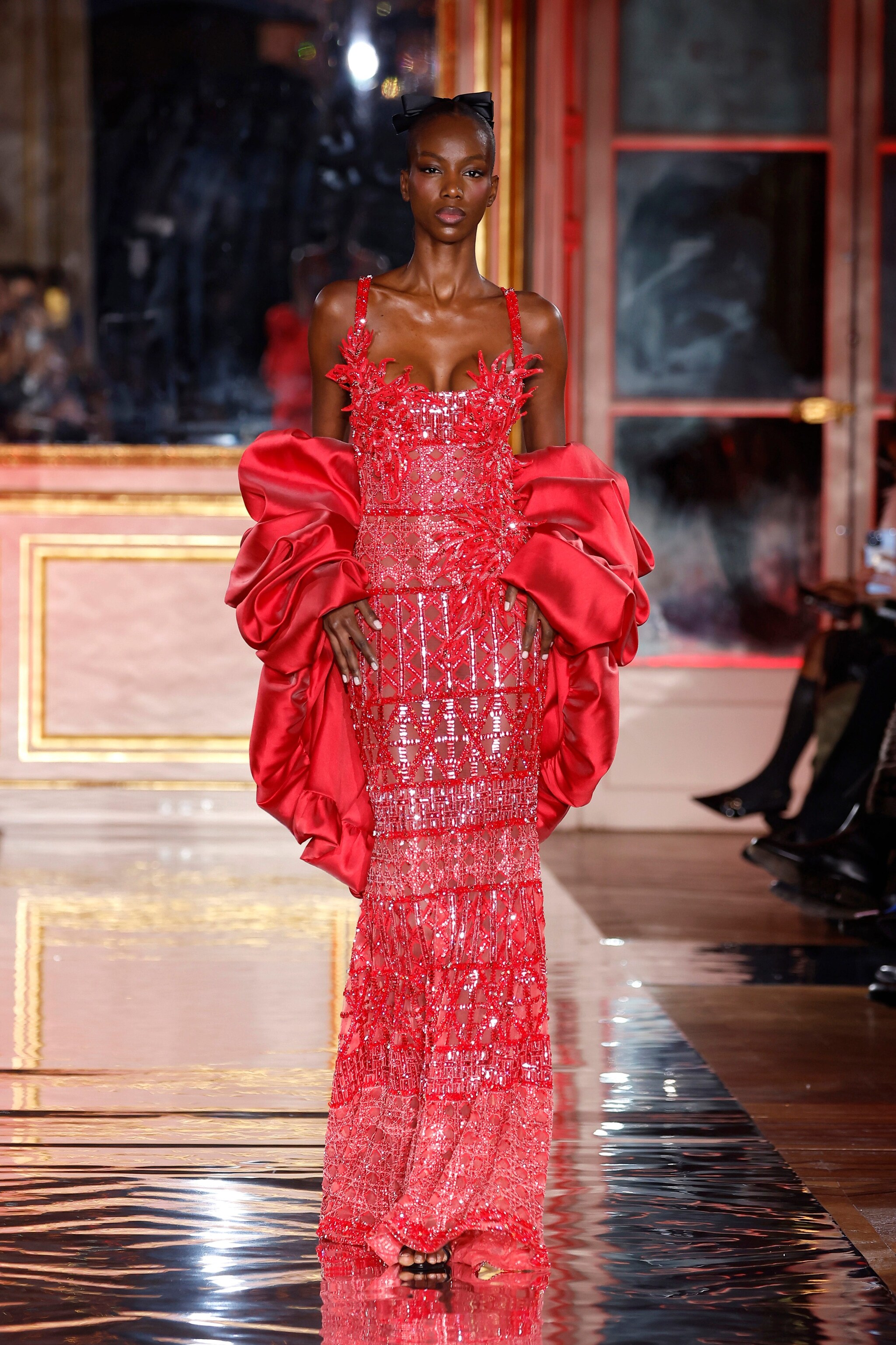 Colori accesi e tonalità pastello si mescolano con decori barocchi, drappeggi e cristalli sulla passerella Haute Couture Primavera/Estate 2025 di Zuhair Murad alla Paris Fashion Week