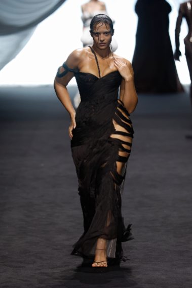 Sfila alla Paris Fashion Week la collezione Haute Couture Primavera/Estate 2025 Jean Paul Gaultier firmata da Ludovic de Saint Sernin, designer che porta in passerella moderne sirene che indossano corsetti stringati, abiti a rete e lunghi modelli in morbido chiffon plissettato o completi e tubini in pelle nera effetto cocco.